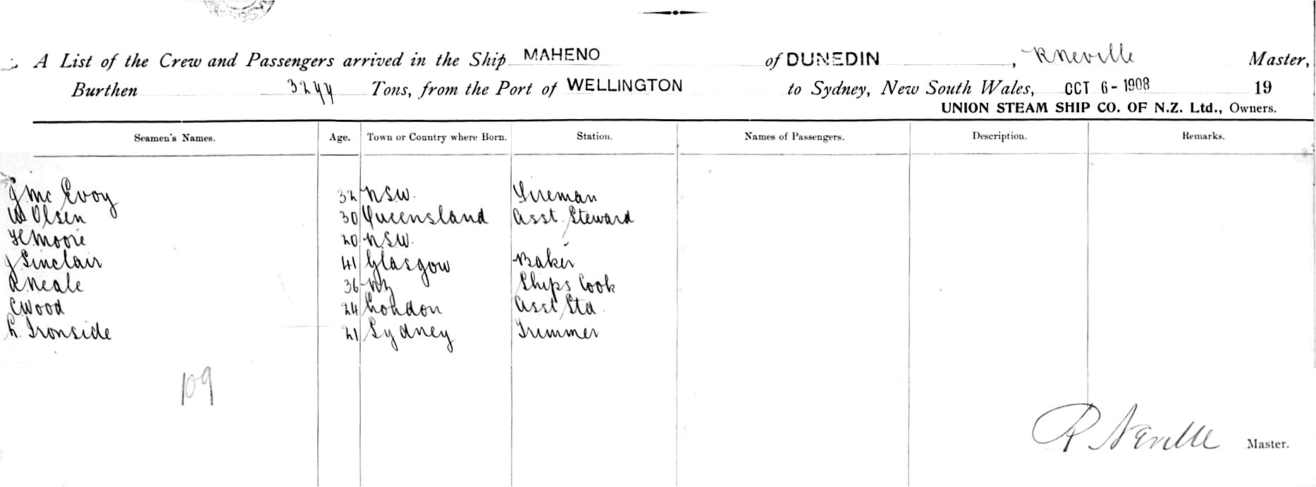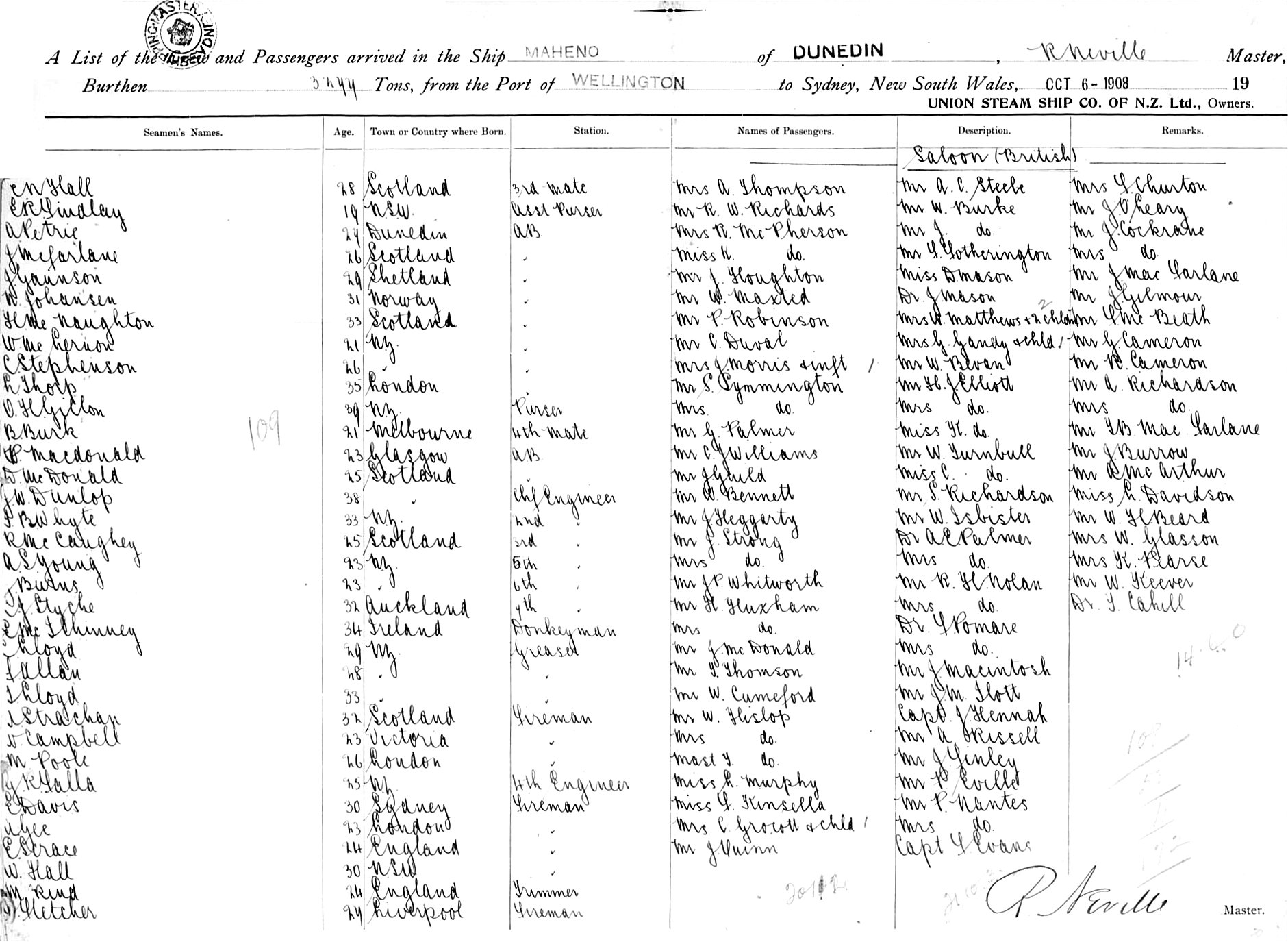 Mariners and ships in Australian Waters | MAHENOOF DUNEDIN, R. NELVILLE, MASTER, BURTHEN 3277 TONS FROM THE PORT OF WELLINGTON TO SYDNEY NEW SOUTH WALES, 6TH OCTOBER, 1908 |
