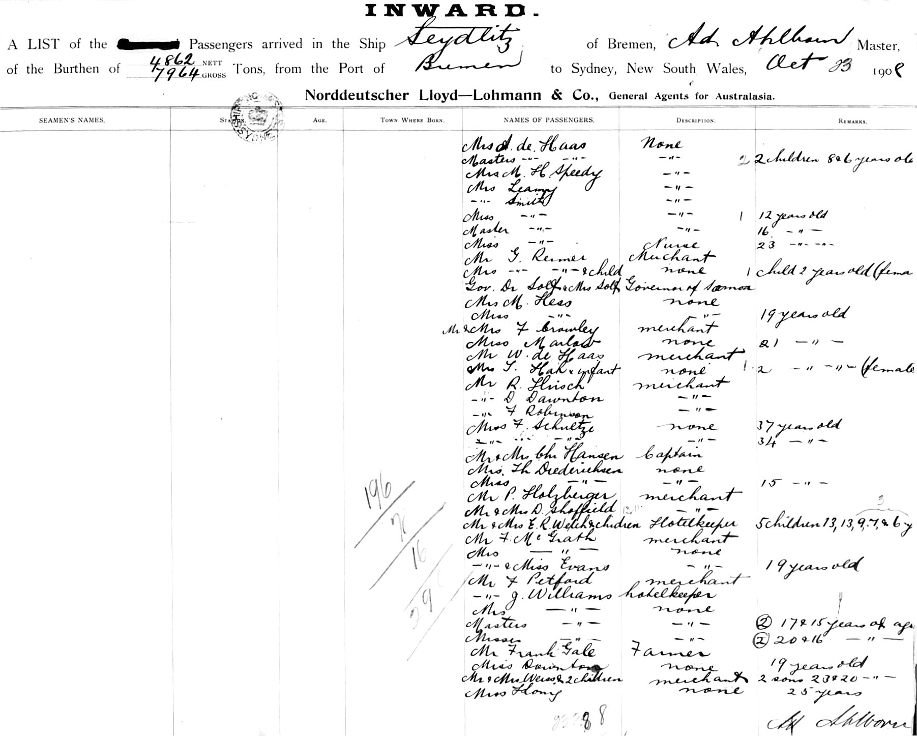 OF BREMEN, A AHLBORN, MASTER, BURTHEN 7964/4862 TONS, FROM THE PORT OF BREMEN via MELBOURNE TO SYDNEY, NEW SOUTH WALES, 23RD OCTOBER 1908