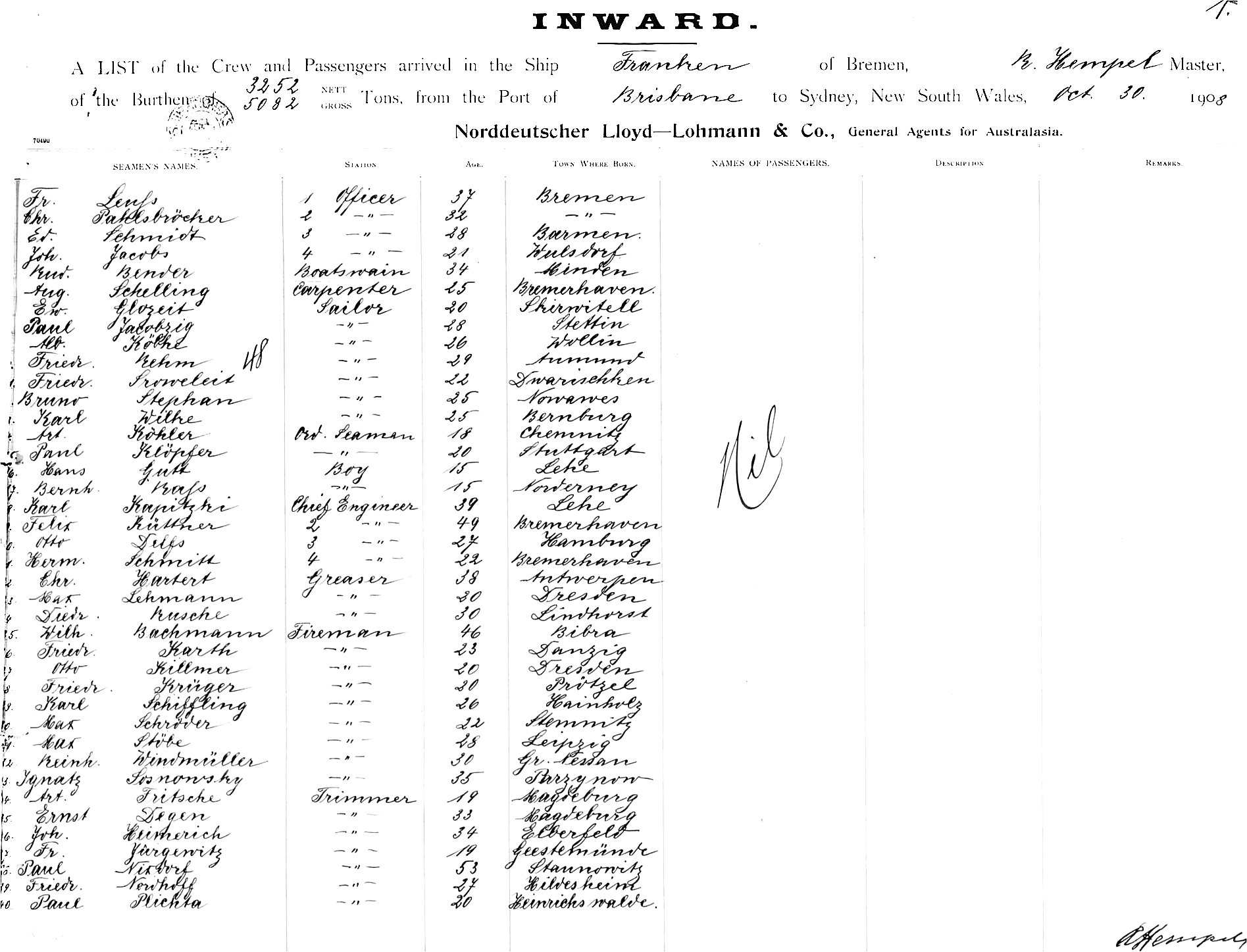 FRANKENOF BREMEN, R. HEMPEL, MASTER, BURTHEN 3252 / 5082 TONS FROM THE PORT OF BRISBANE TO SYDNEY NEW SOUTH WALES, 30TH OCTOBER 1908 |
