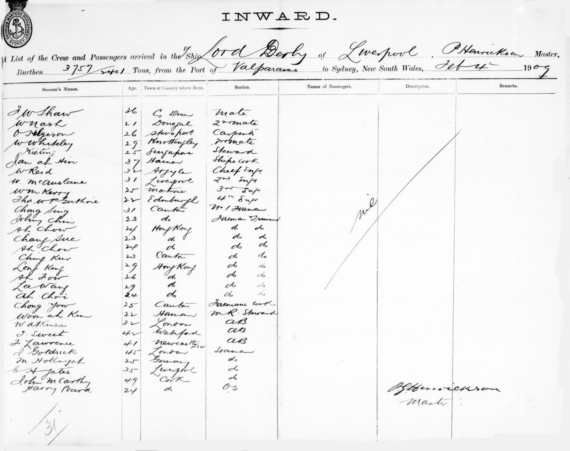 LORD DERBYSTEAMSHIP OF LIVERPOOL, P.G. HENRICKSON, MASTER, BURTHEN 3757 / 2401 TONS FROM THE PORT OF VALPARAISO TO SYDNEY, NEW SOUTH WALES, 4TH FEBRUARY 1909 |