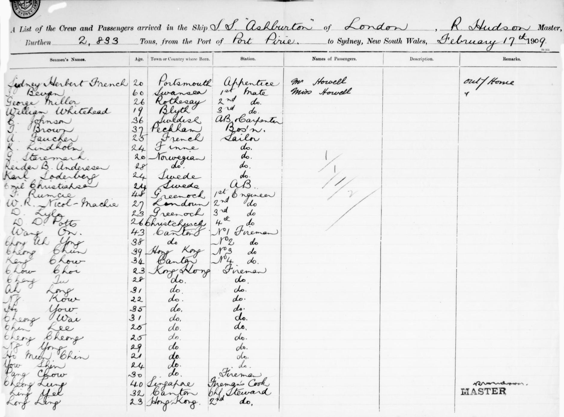 ASHBURTONSTEAMSHIP OF LONDON, R. HUDSON, MASTER, BURTHEN 2833 TONS FROM THE PORT OF PORT PIRIE TO SYDNEY, NEW SOUTH WALES, 17TH FEBRUARY 1909 |