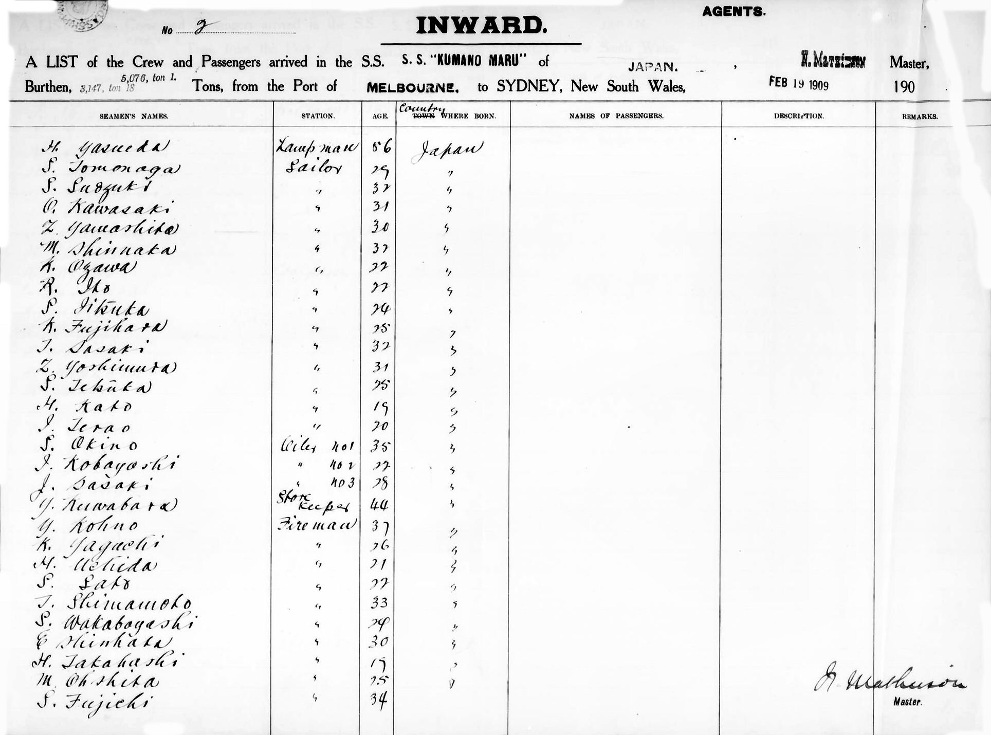 KUMANO MARUSTEAMSHIP OF JAPAN, N. MATHIESON, MASTER, BURTHEN 3147 / 5076 TONS FROM THE PORT OF MELBOURNE TO SYDNEY, NEW SOUTH WALES, 19TH FEBRUARY 1909 |