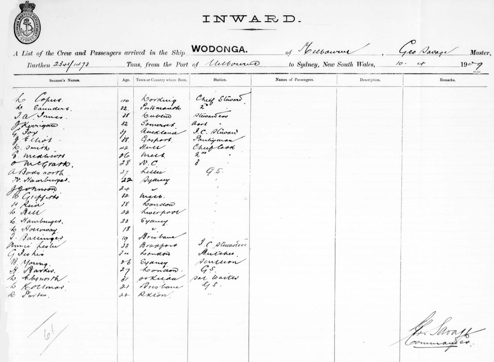 WODONGAOF MELBOURNE, GEORGE SAVAGE, MASTER, BURTHEN 2341 / 1473 TONS FROM THE PORT OF MELBOURNE TO SYDNEY, NEW SOUTH WALES, 10TH APRIL 1909 |