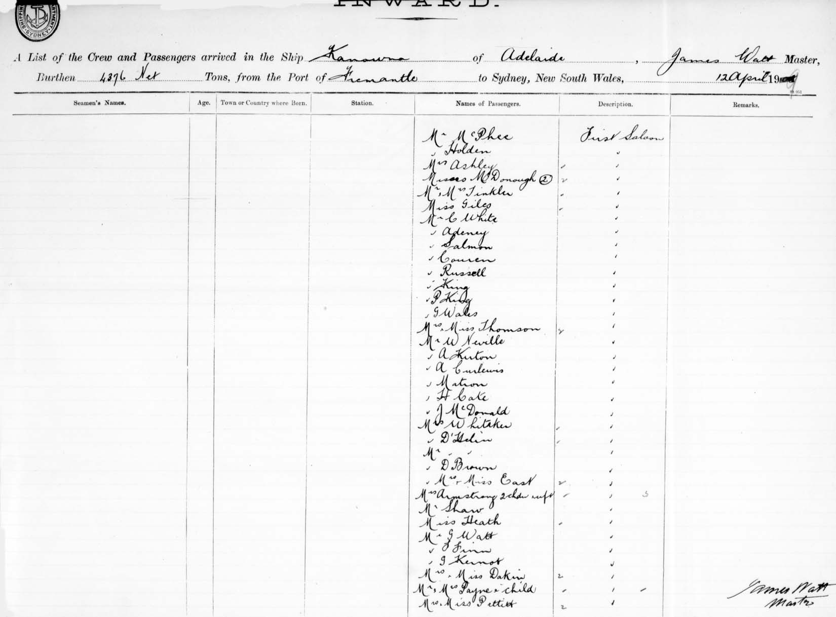 OF ADELAIDE, JAMES WATT, MASTER, BURTHEN 4376 TONS FROM THE PORT OF FREMANTLE via MELBOURNE TO SYDNEY, NEW SOUTH WALES, 12TH APRIL 1909