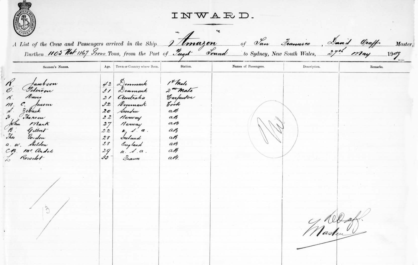 FROM THE PORT OF PUGET SOUND TO SYDNEY, NEW SOUTH WALES, 27TH MAY 1909 |