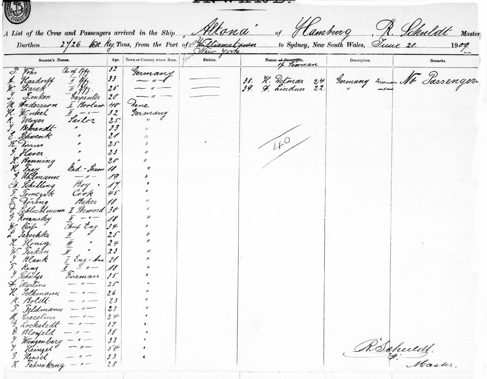 OF HAMBURG, R. SCHULDT, MASTER, BURTHEN 2726 TONS FROM THE PORT OF NEW YORK via WILLIAMSTOWN TO SYDNEY, NEW SOUTH WALES, 21ST JUNE 1909 |