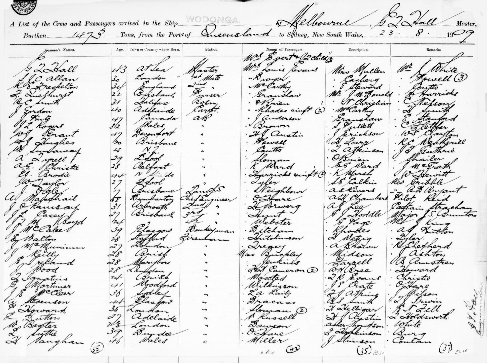 WODONGAOF MELBOURNE, G. T. HALL, MASTER, BURTHEN 1473 TONS FROM THE PORTS OF QUEENSLAND TO SYDNEY, NEW SOUTH WALES, 23RD AUGUST 1909 |