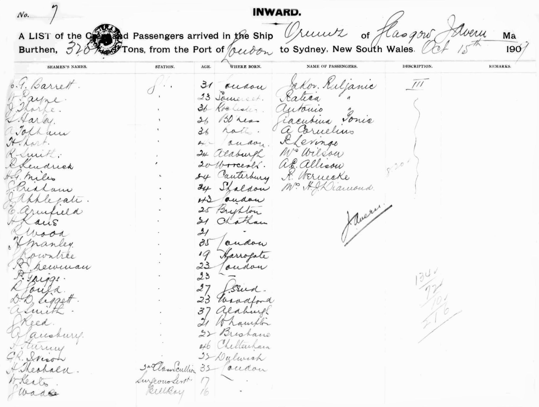Source: State Records Authority of New South Wales: Shipping Master's Office; Passengers Arriving 1855 - 1922; NRS13278, [X332] reel 2048. Transcribed by Dorothy D'Arcy. Proofread by Lyn & Maurie.
