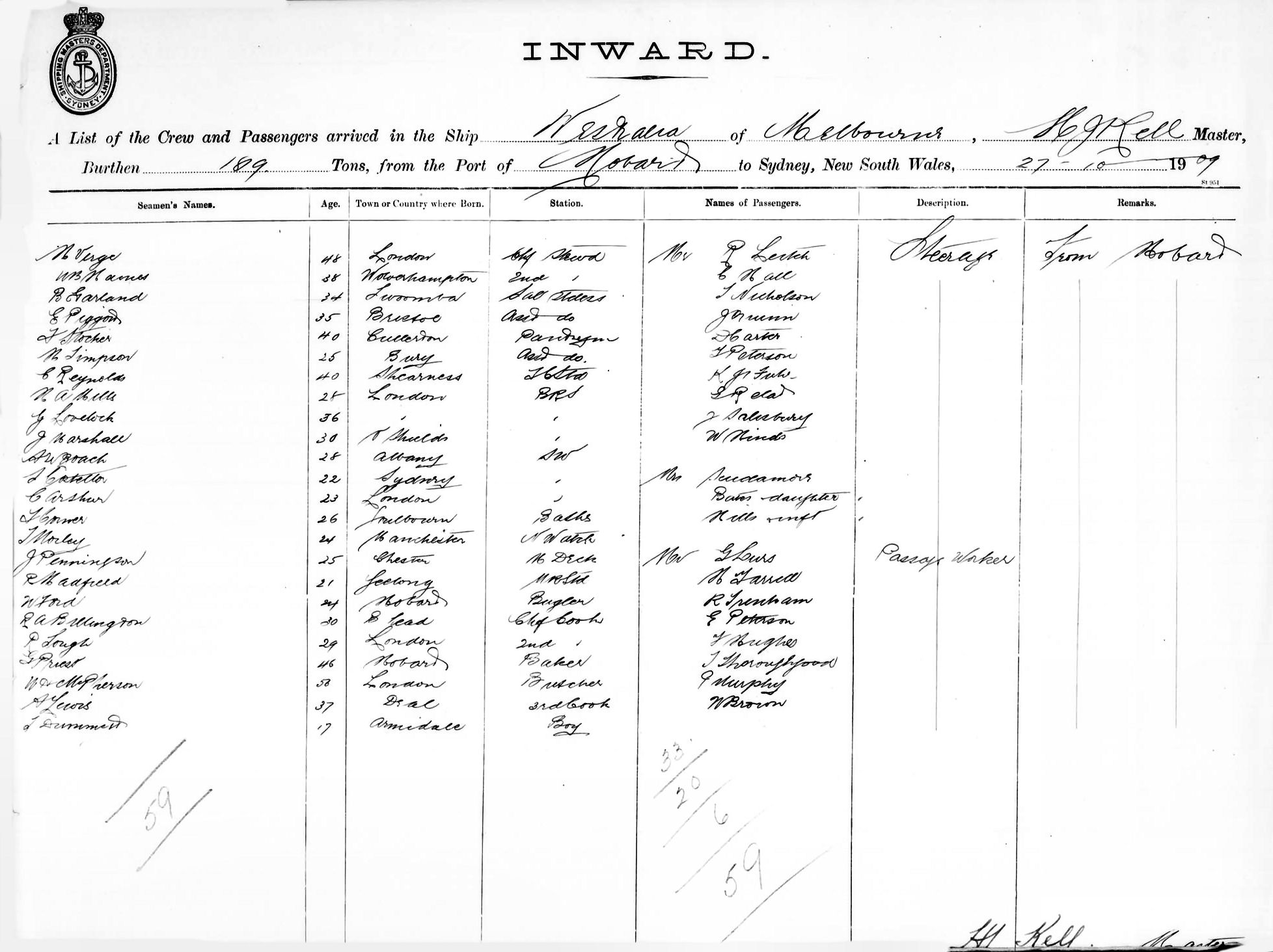 WESTRALIAOF MELBOURNE, H. J. KELL, MASTER, BURTHEN 1819 TONS FROM THE PORT OF HOBART TO SYDNEY, NEW SOUTH WALES, 27TH OCTOBER, 1909 |