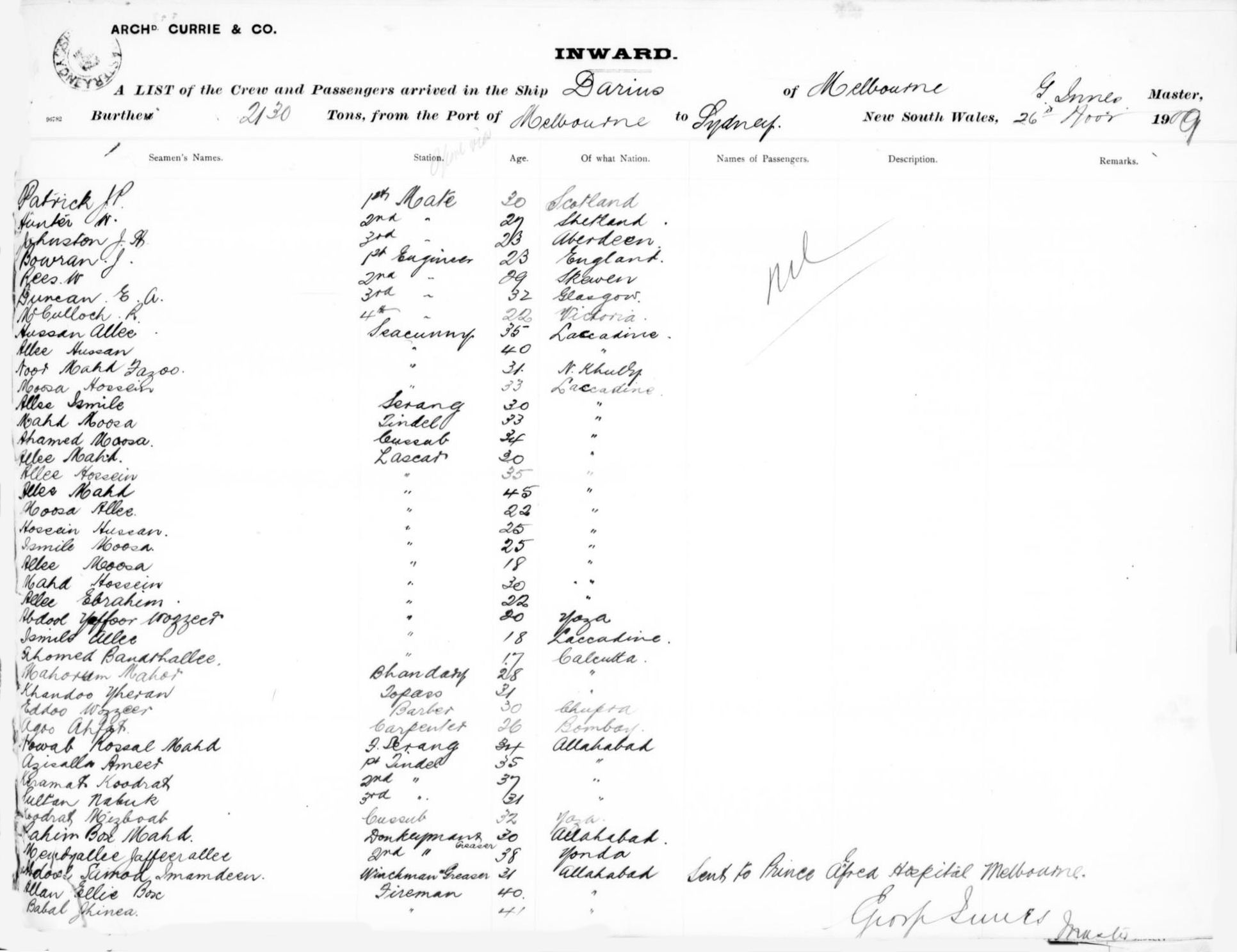 DARIUSOF MELBOURNE, G. INNES, MASTER, BURTHEN 2130 TONS FROM THE PORT OF SINGAPORE via MELBOURNE TO SYDNEY, NEW SOUTH WALES, 26TH NOVEMBER 1909 |