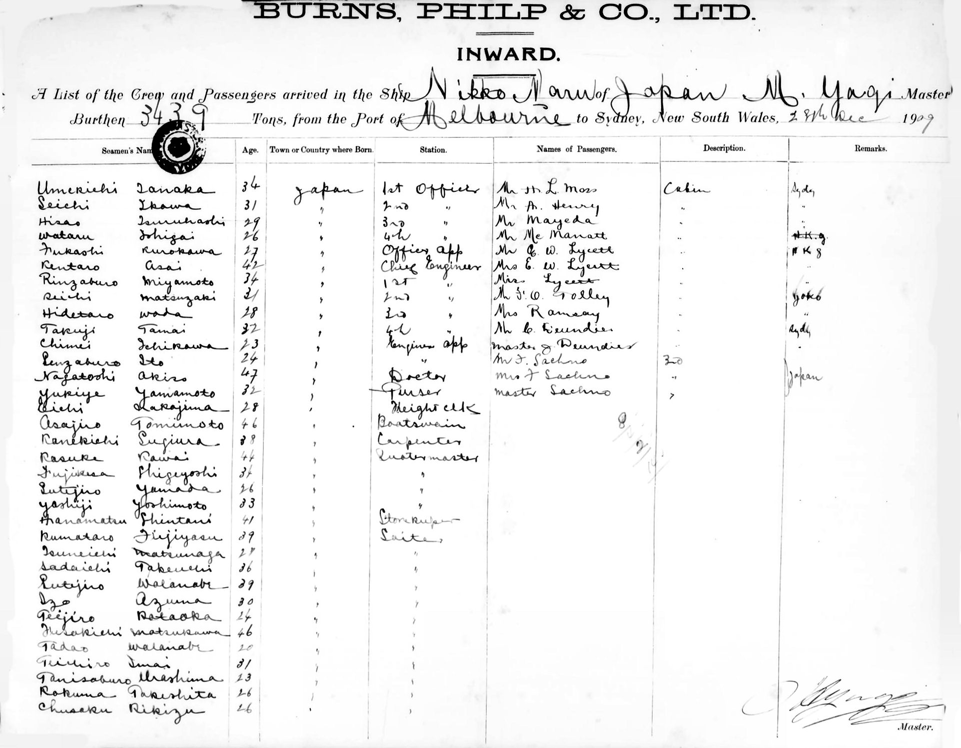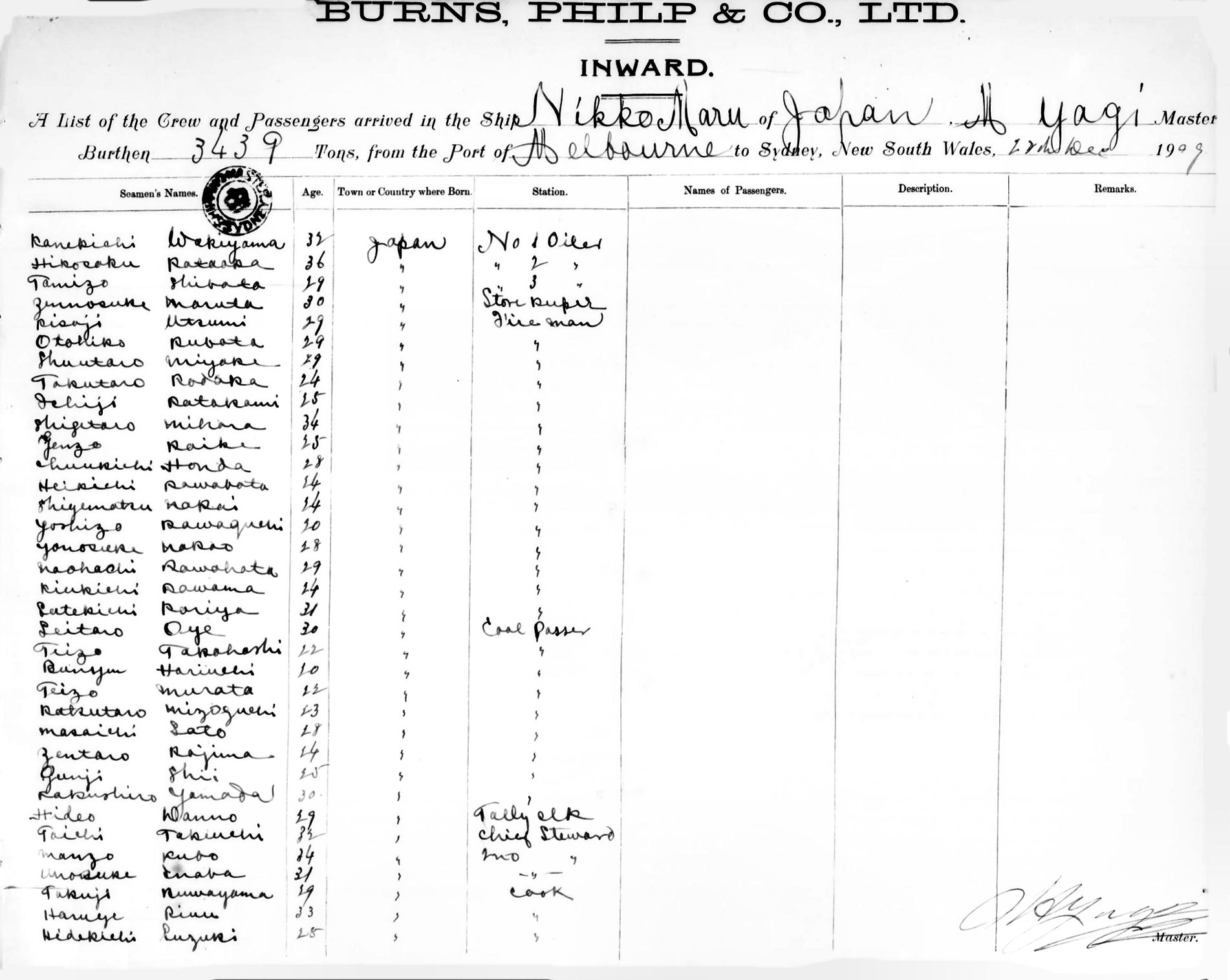 NIKKO MARUOF JAPAN, M. YAGI, MASTER, BURTHEN 3439 TONS, FROM THE PORT OF MELBOURNE TO SYDNEY, NEW SOUTH WALES, 28TH DECEMBER 1909 |
