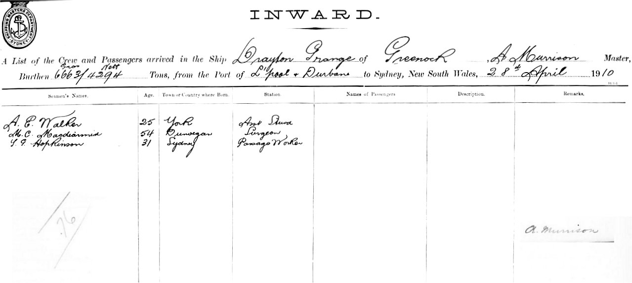 BUNINYONGOF ADELAIDE, J. M. SNOW, MASTER, BURTHEN 2070/1289 TONS FROM THE PORTS OF ROCKHAMPTION & BRISBANE TO SYDNEY, NEW SOUTH WALES, 27TH APRIL 1910 |