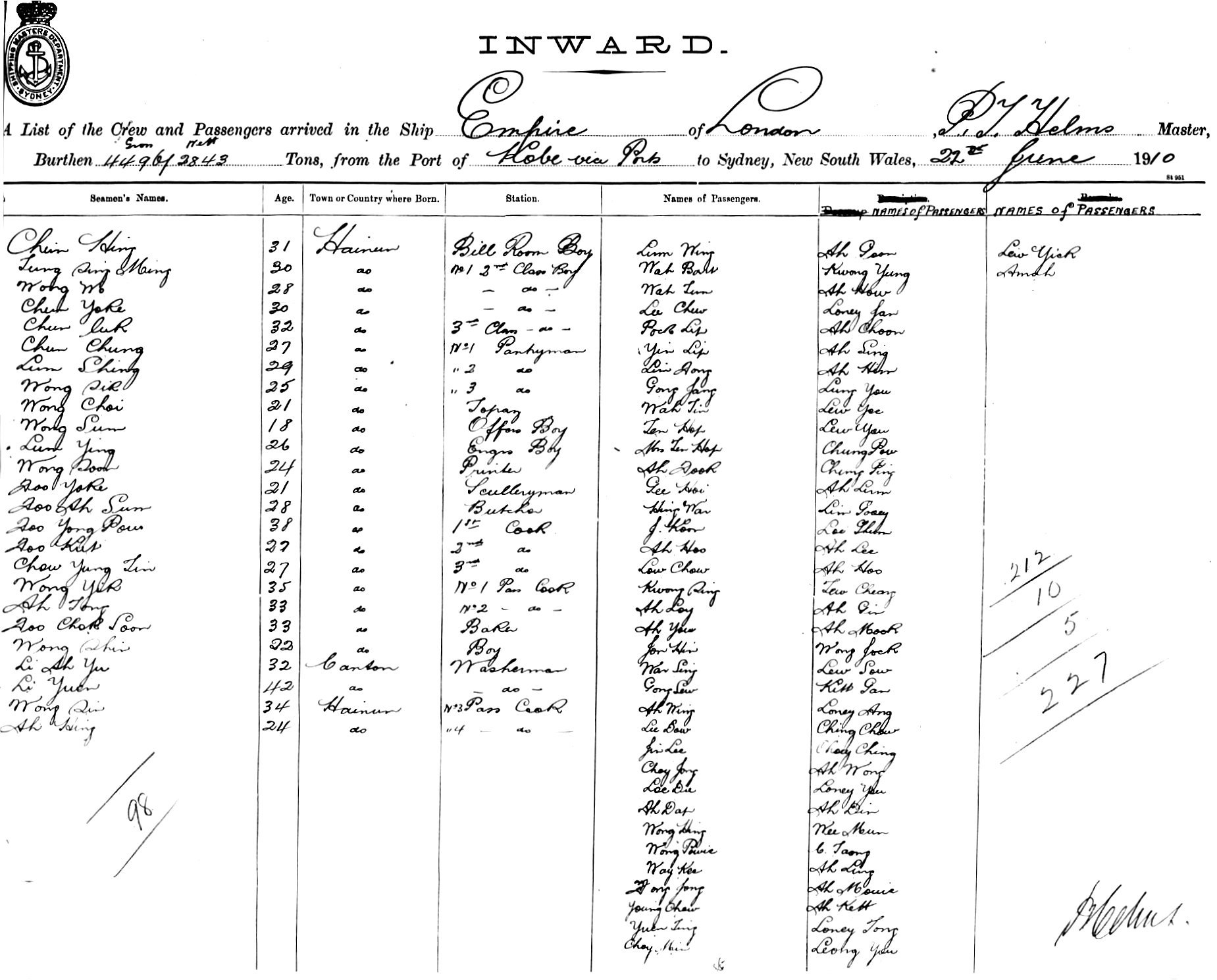 EMPIREOF LONDON, P. T. HOLMS, MASTER, BURTHEN 4496/2843 TONS FROM THE PORT OF KOBE & PORTS VIA BRISBANETO SYDNEY, NEW SOUTH WALES, 22 JUNE 1910 |