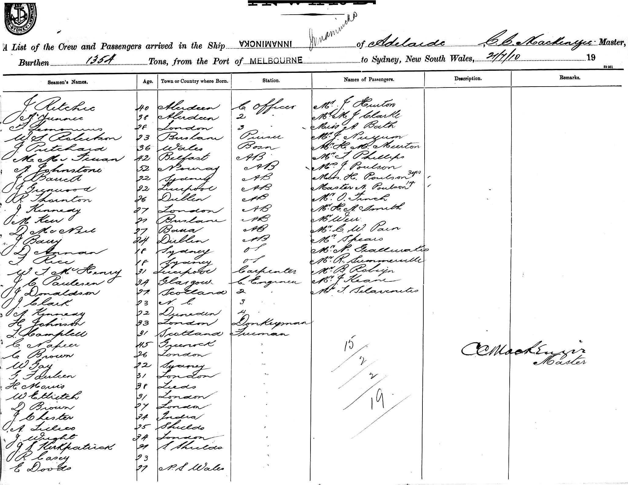 Source: State Records Authority of New South Wales: Shipping Master's Office; Passengers Arriving 1855 - 1922; NRS13278, [X341] reel 2054. Transcribed by Ian Sinclair. You may view/print a scan of the original list - a monitor set to high resolution is recommended for clarity. Use your back button to return. |
