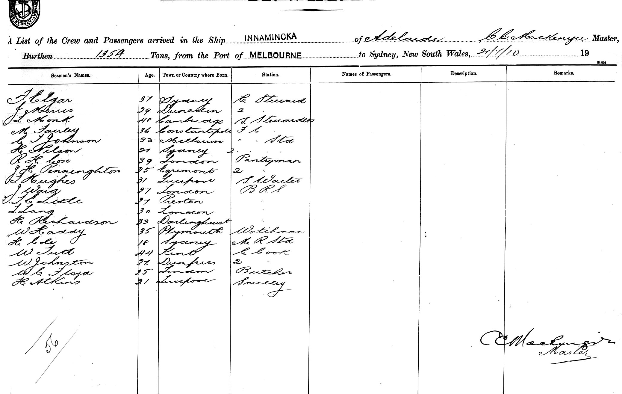 INNAMINCKAOF ADELAIDE, C. C. MACKENZIE, MASTER, BURTHEN 1354 TONS FROM THE PORT OF MELBOURNE TO SYDNEY, NEW SOUTH WALES, 21 JULY 1910 |