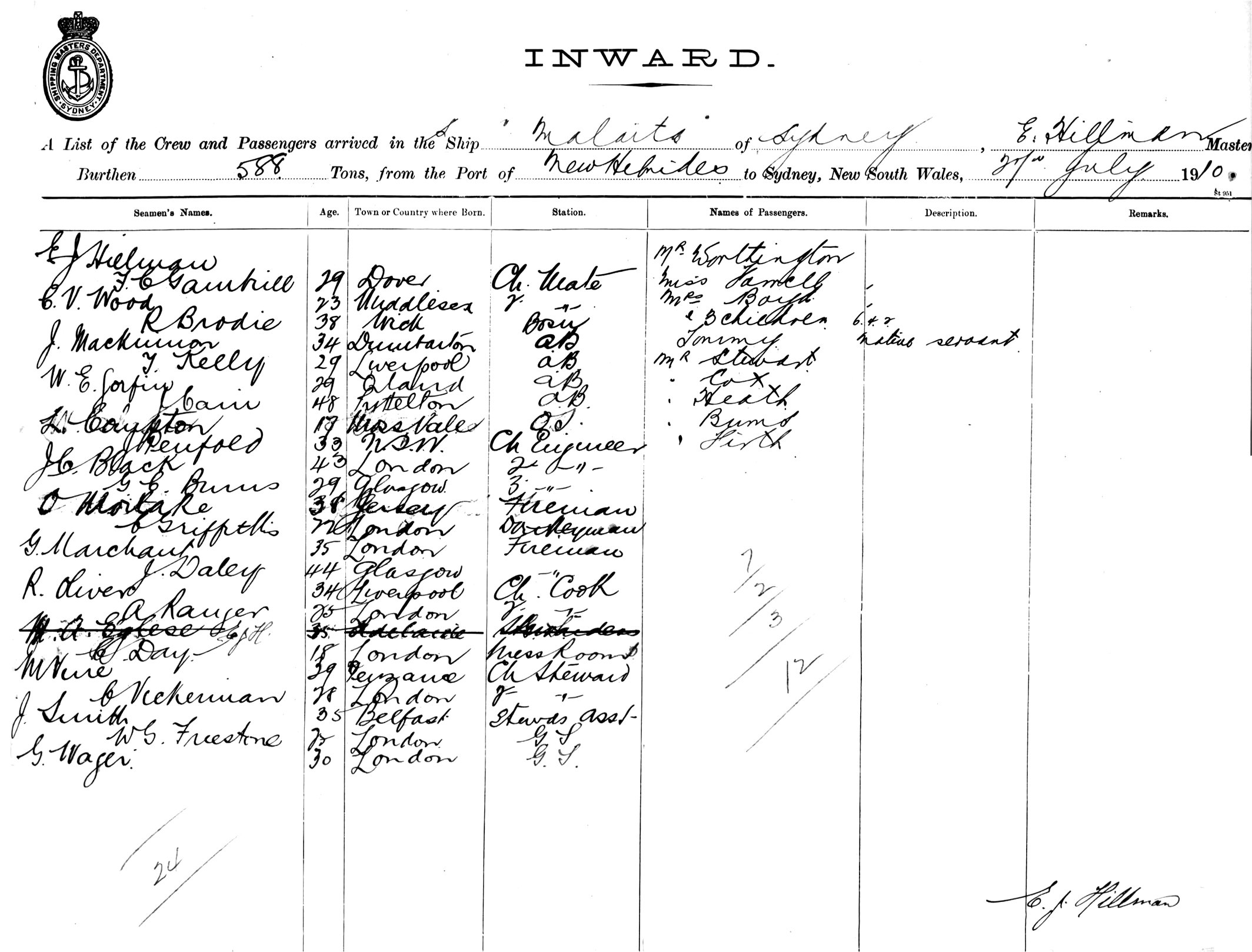 MALAITSOF SYDNEY, E. J. HILLMAN , MASTER, BURTHEN 588 TONS FROM THE PORT OF NEW HEBRIDES TO SYDNEY, NEW SOUTH WALES, 27 JULY 1910 |