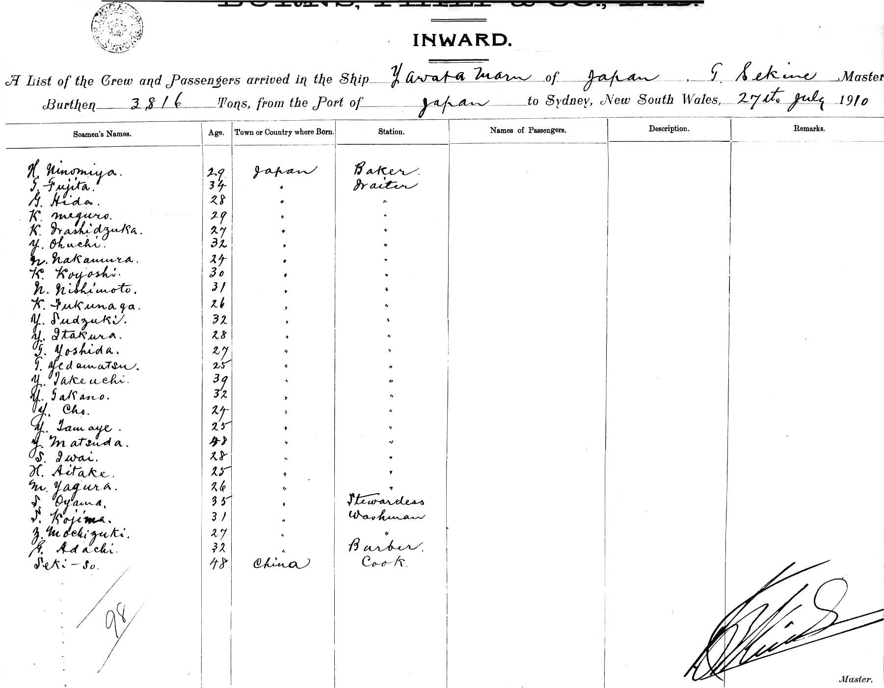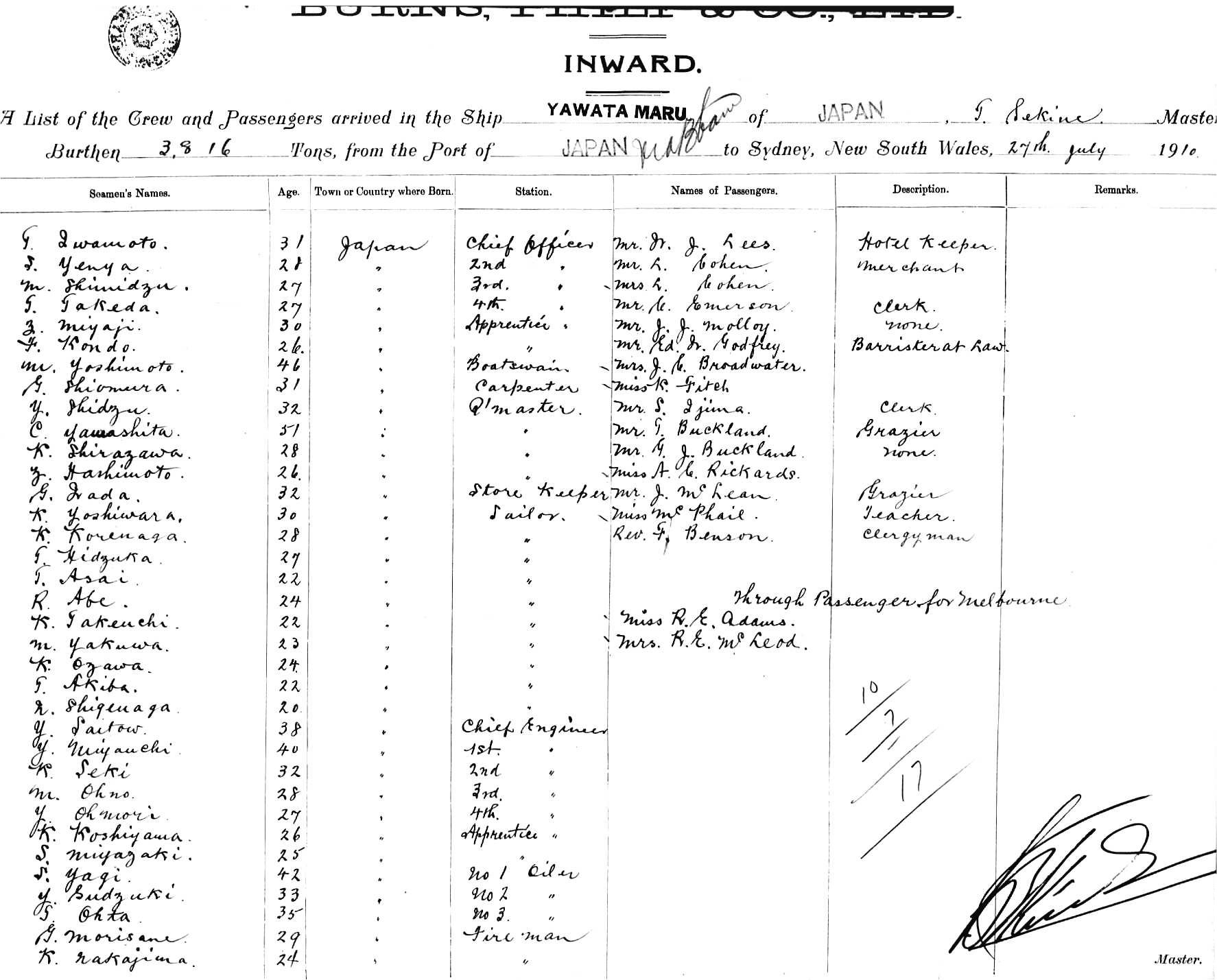 YAWATA MARUOF JAPAN, T SEKINE, MASTER, BURTHEN 3816 TONS FROM THE PORT OF JAPAN VIA BRISBANE TO SYDNEY, NEW SOUTH WALES, JULY, 1910 |