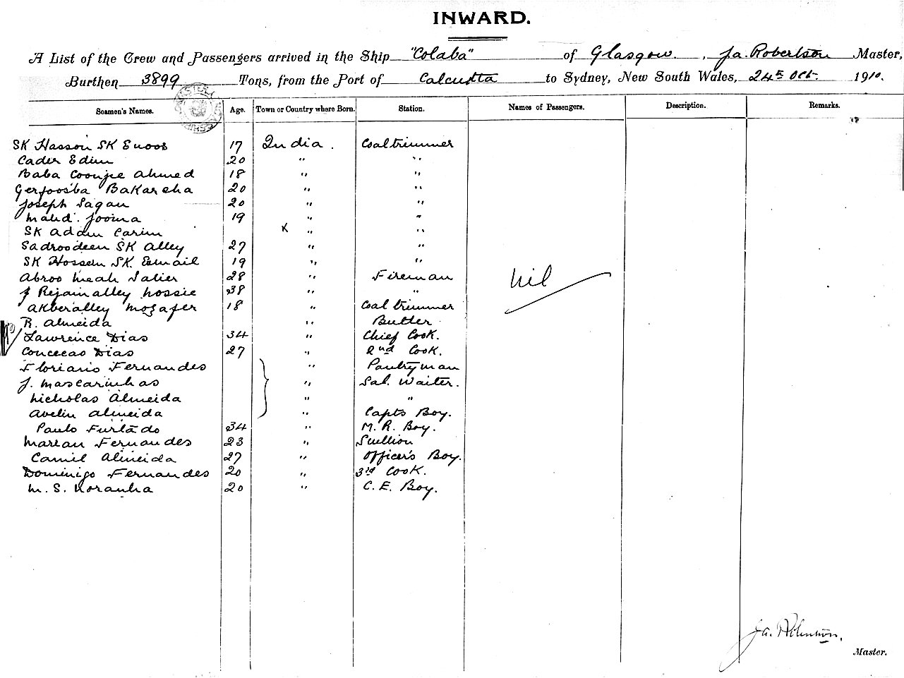 COLABAOF GLASGOW, JA. ROBERTSON, MASTER, BURTHEN 3899 TONS FROM THE PORT OF CALCUTTA VIA MELBOURNE TO SYDNEY NEW SOUTH WALES, 24TH OCTOBER, 1910 |