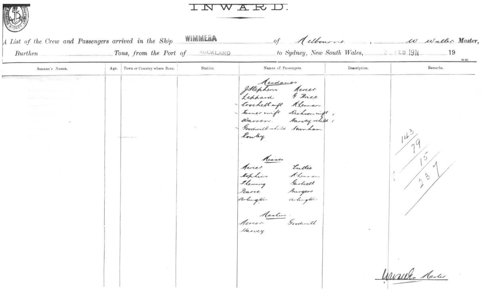 WIMMERAOF MELBOURNE, W. WALKER, MASTER, BURTHEN 1871 TONS FROM THE PORT OF AUCKLAND TO SYDNEY, NEW SOUTH WALES, 24TH FEBRUARY 1911 |
