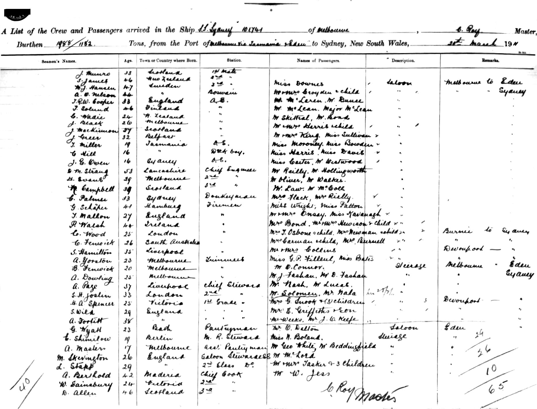 SYDNEYOF MELBOURNE, C. ROY, MASTER, BURTHEN 1988/1182 TONS FROM THE PORT OF MELBOURNE VIA TASMANIA & EDEN TO SYDNEY, NEW SOUTH WALES, 20TH MARCH 1911 |
