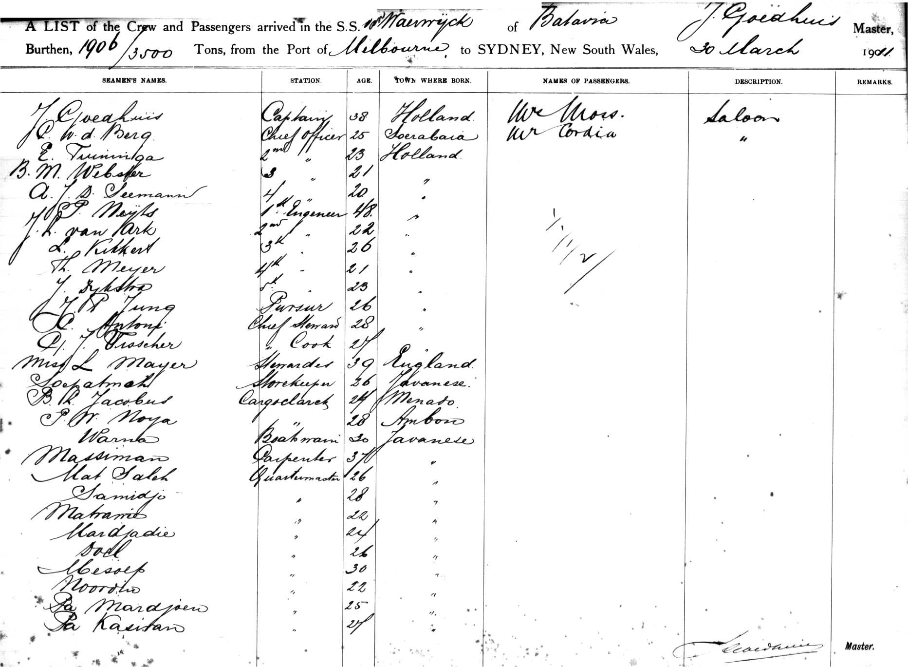 VAN WAERWIJCKOF BATAVIA, J. GOEDHUIS, MASTER, BURTHEN 1906/3500 TONS FROM THE PORT OF MELBOURNE TO SYDNEY, NEW SOUTH WALES, 30TH MARCH 1911 |