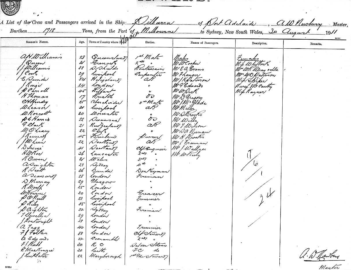 PILBARRAOF PORT ADELAIDE, A. W. NEWBURY, MASTER, BURTHEN 1718 TONS FROM THE PORTS OF W.A. via MELBOURNE TO SYDNEY, NEW SOUTH WALES, 30TH AUGUST 1911 |