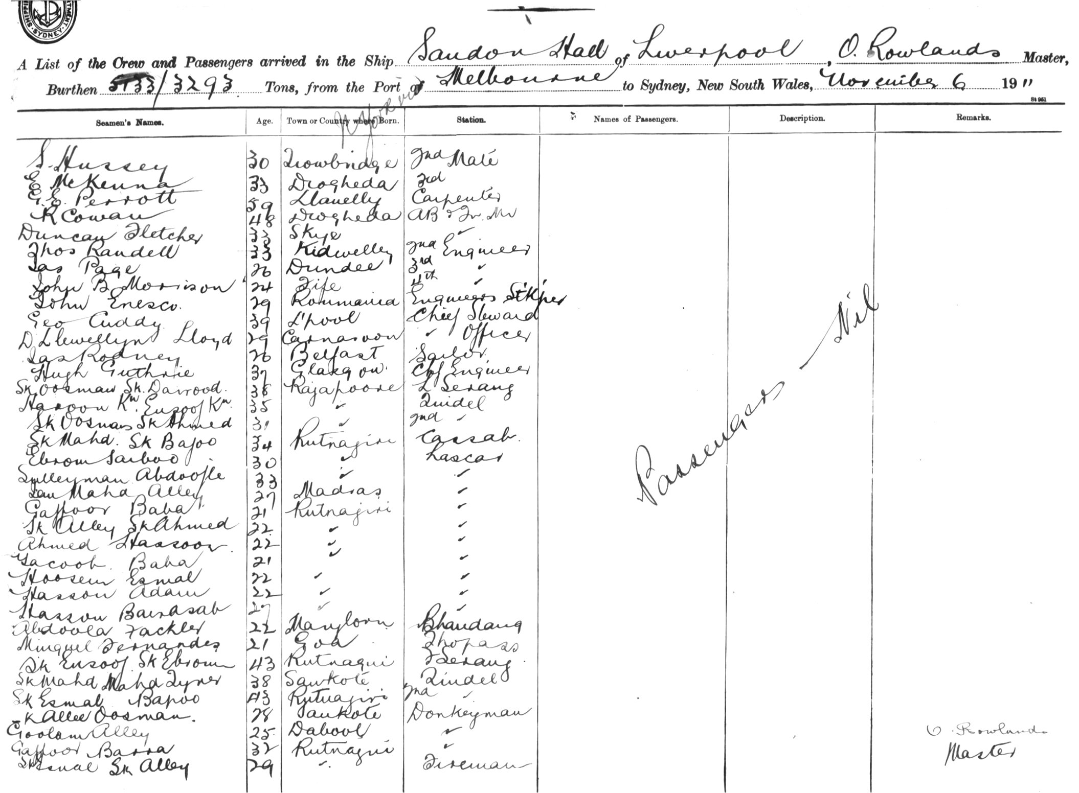 SANDON HALLOF LIVERPOOL, O. ROWLANDS, MASTER, BURTHEN 5133/3293 TONS FROM THE PORT OF NEW YORK via MELBOURNE TO SYDNEY, NEW SOUTH WALES, 6 NOVEMBER 1911 |