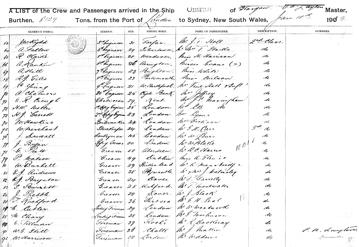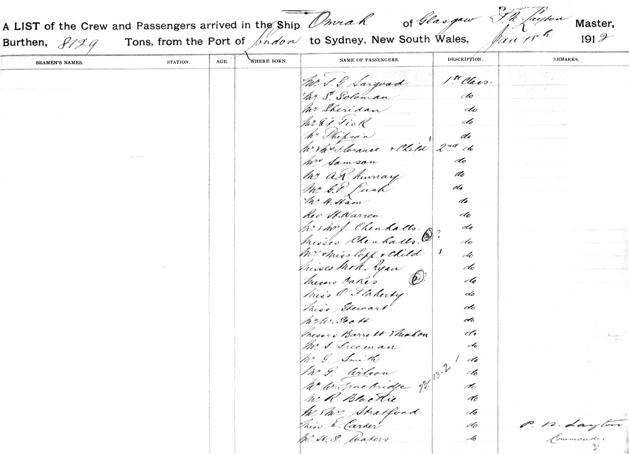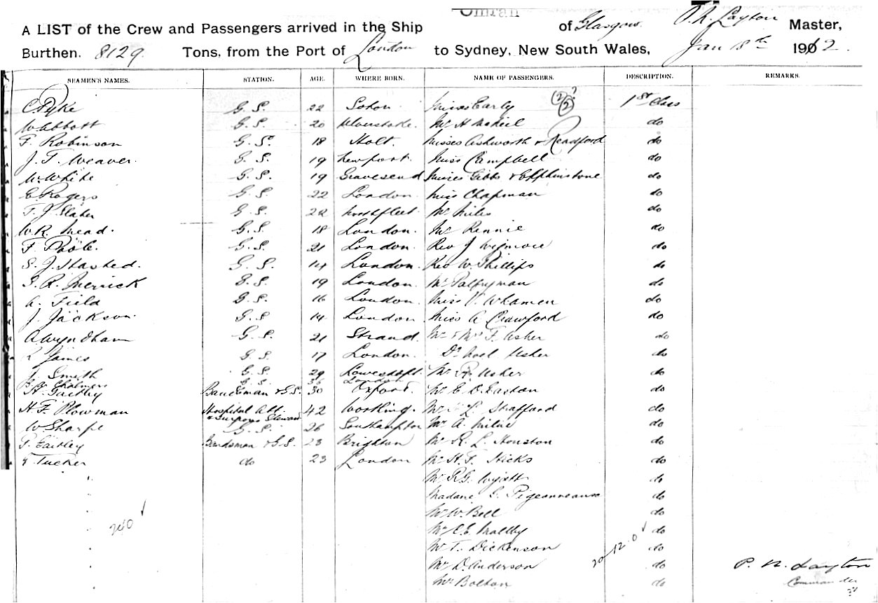 Source: State Records Authority of New South Wales: Shipping Master's Office; Passengers Arriving 1855 - 1922; NRS13278, [X359] reel 2060. Transcribed by Carolyn Gordon.