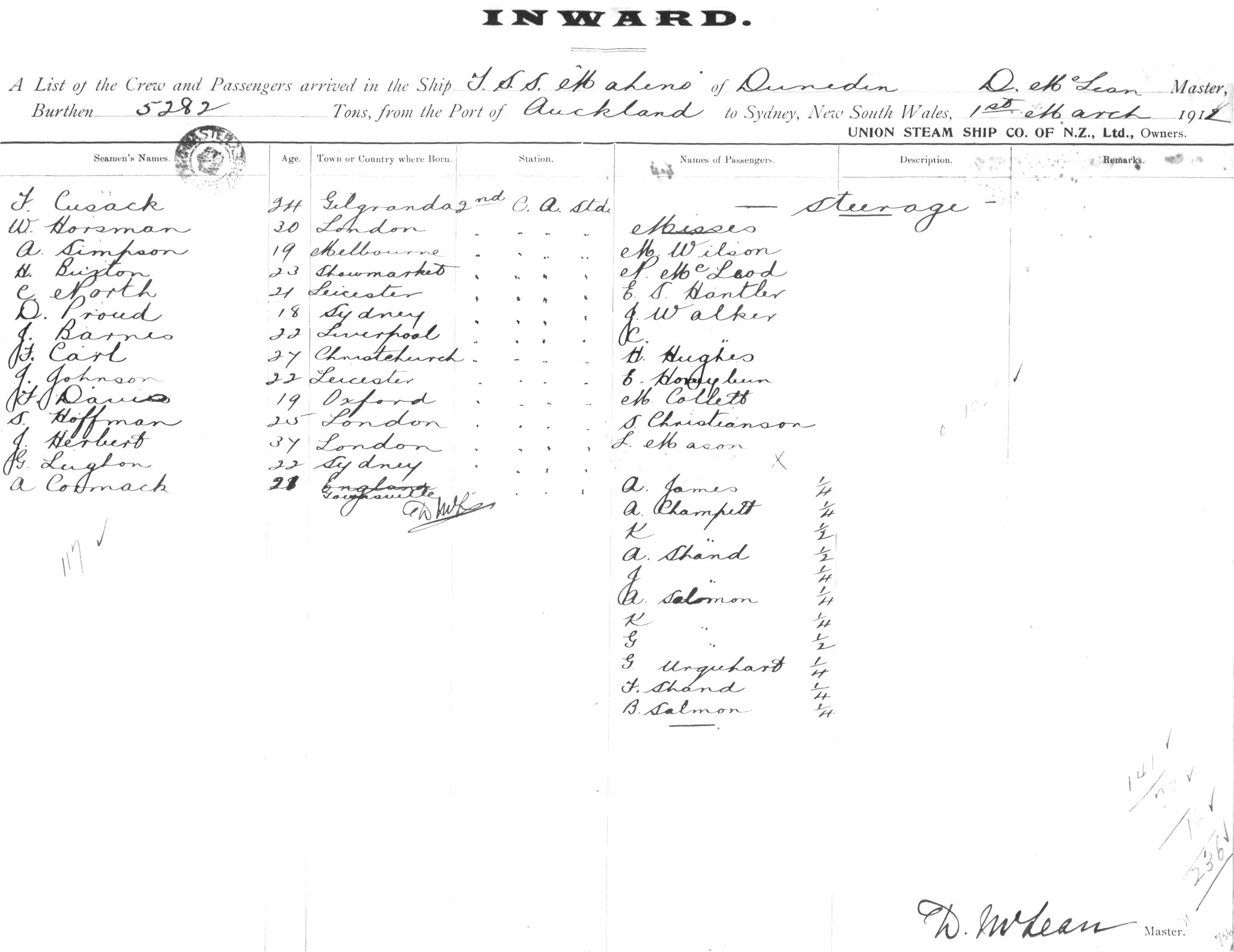 MAHENOOF DUNEDIN, D. MCLEAN MASTER, BURTHEN 5282 TONS FROM THE PORT OF AUCKLAND TO SYDNEY, NEW SOUTH WALES, 1ST MARCH 1912 |