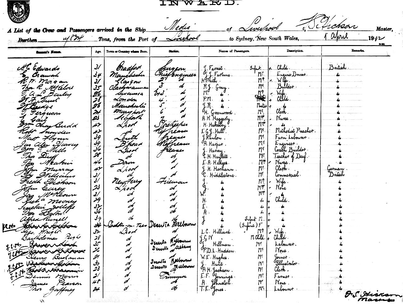 Mariners and ships in Australian Waters | MEDICOF LIVERPOOL, F. S. HICKSON, MASTER, BURTHEN 7824 TONS FROM THE PORT OF LIVERPOOL VIA MELBOURNE TO SYDNEY, NEW SOUTH WALES, 1 APRIL 1912 |