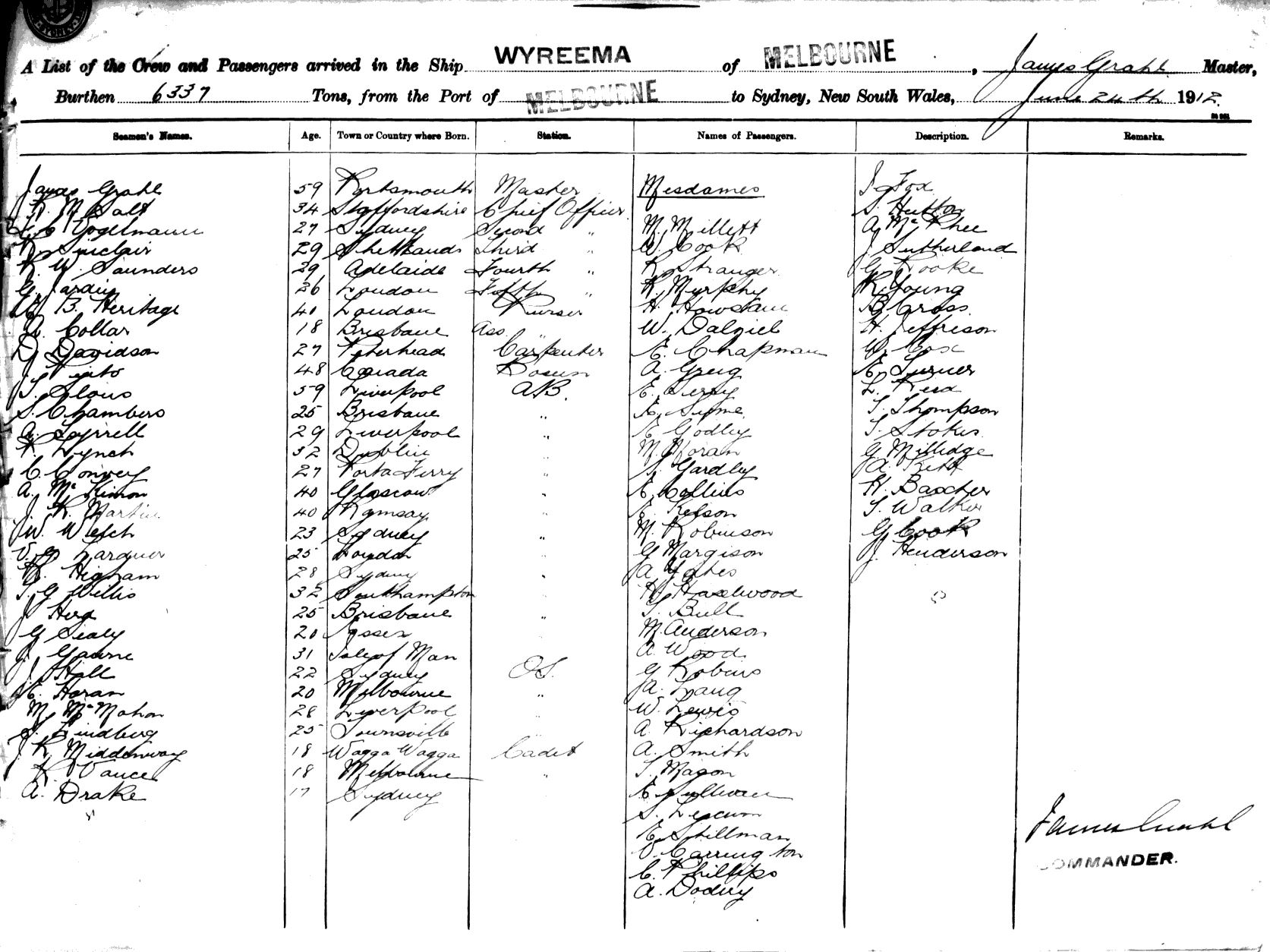 WYREEMAOF MELBOURNE, JAMES GRAHL, MASTER, BURTHEN 6337 TONS FROM THE PORT OF MELBOURNE TO SYDNEY, NEW SOUTH WALES, 24TH JUNE 1912 |
