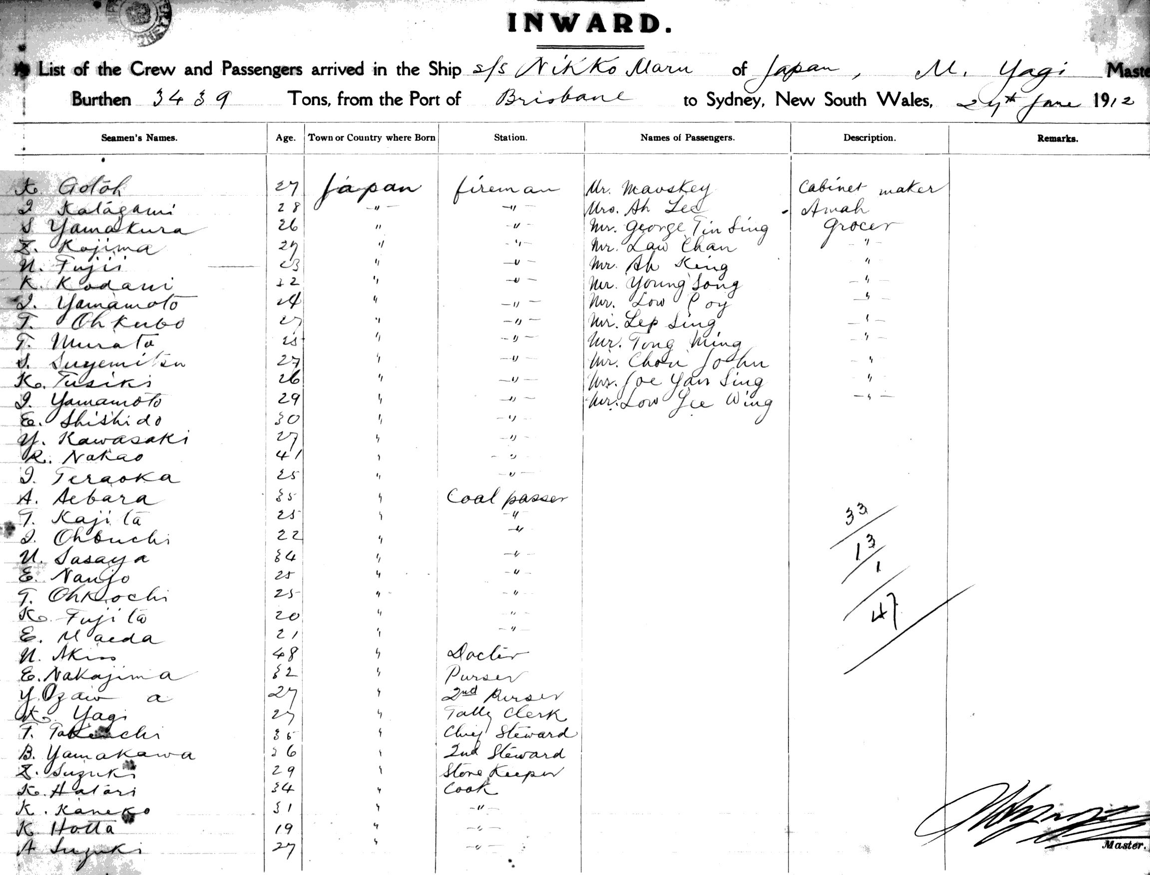 NIKKO MARUOF JAPAN, M. YAGI, MASTER, BURTHEN 3439 TONS FROM THE PORT OF JAPAN via BRISBANE TO SYDNEY, NEW SOUTH WALES, 29TH JUNE 1912 |