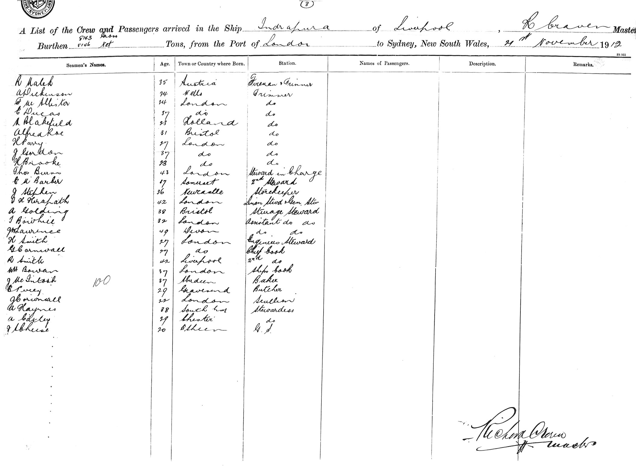 INDRAPURAOF LIVERPOOL, RICHARD CRAVEN, MASTER, BURTHEN 8143/5746 TONS FROM THE PORT OF LONDON via MELBOURNE TO SYDNEY, NEW SOUTH WALES, 21ST NOVEMBER 1912 |
