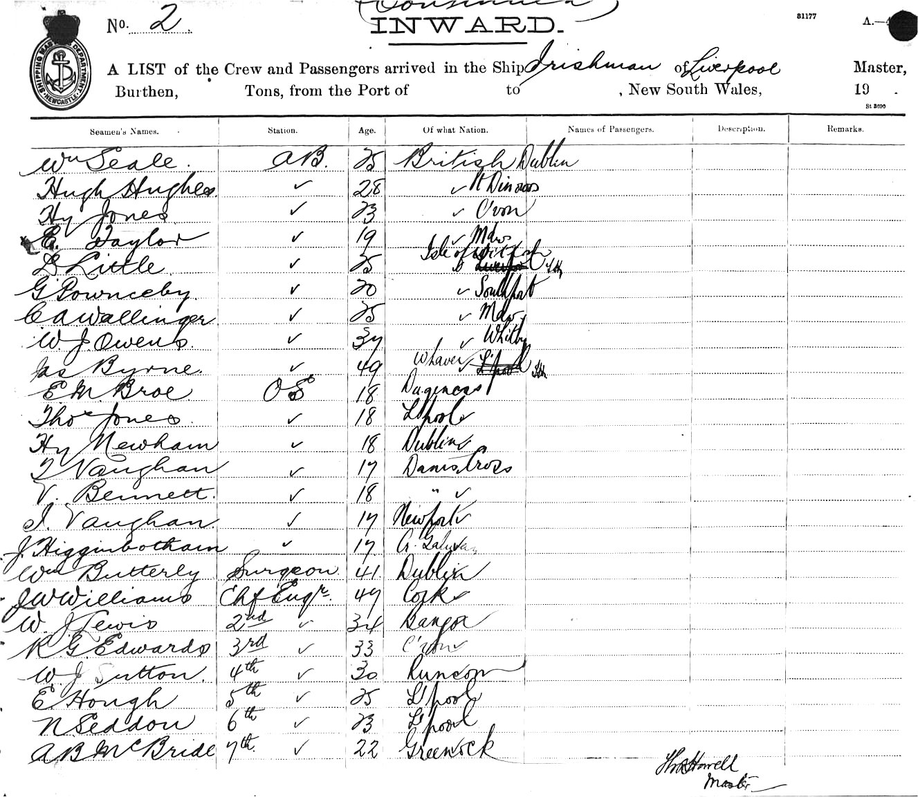 IRISHMANOF LIVERPOOL, THOS. HOWELL, MASTER, BURTHEN 8612 TONS, FROM THE PORT OF NEWCASTLE,NSW TO SYDNEY, NEW SOUTH WALES, 1912 |