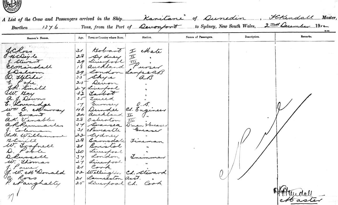 KARITANEOF DUNEDIN, F. G. KENDALL, MASTER, BURTHEN 1376 TONS FROM PORT OF DEVONPORT TO SYDNEY, NEW SOUTH WALES, 2ND DECEMBER 1912 |