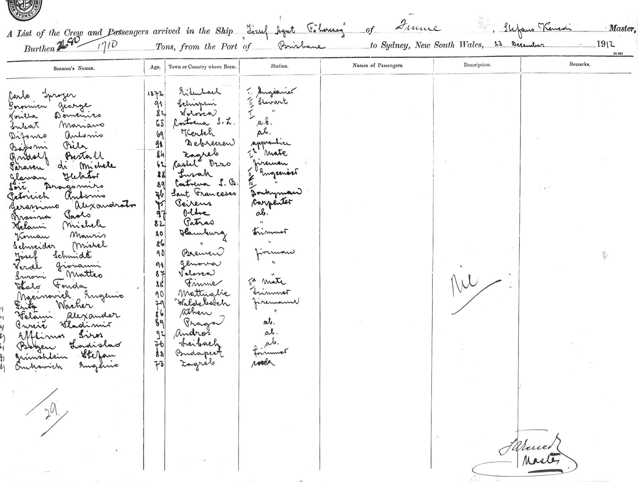 JOZSEF AGOST FOHERCZEGOF FINME ? STEFANO KEUSDI. ? MASTER, BURTHEN, 2680 / 1710 TONS FROM PORT OF BRISBANE TO SYDNEY, NEW SOUTH WALES, 23RD DECEMBER 1912 |