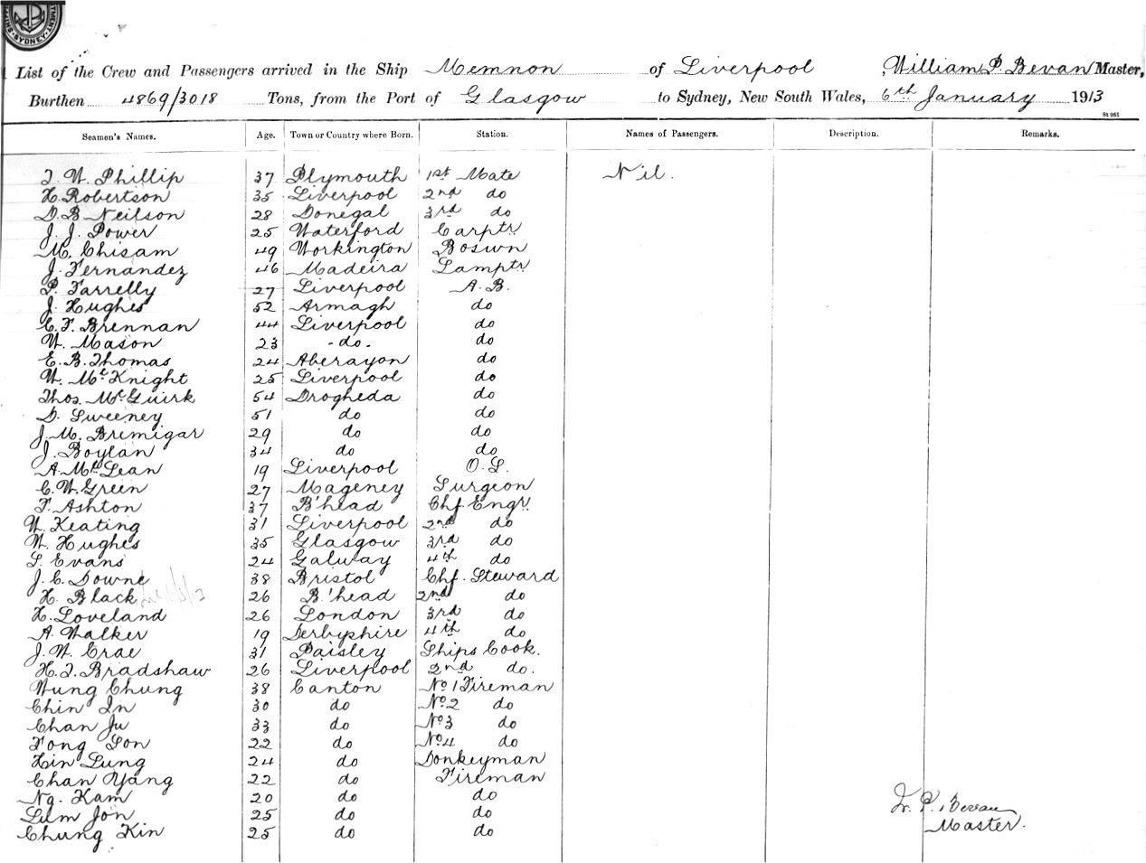 MEMNONOF LIVERPOOL, WILLIAM P BEVAN, MASTER, BURTHEN 4869 TONS FROM THE PORT OF GLASGOW TO SYDNEY, NEW SOUTH WALES, 6TH JANUARY, 1913 |
