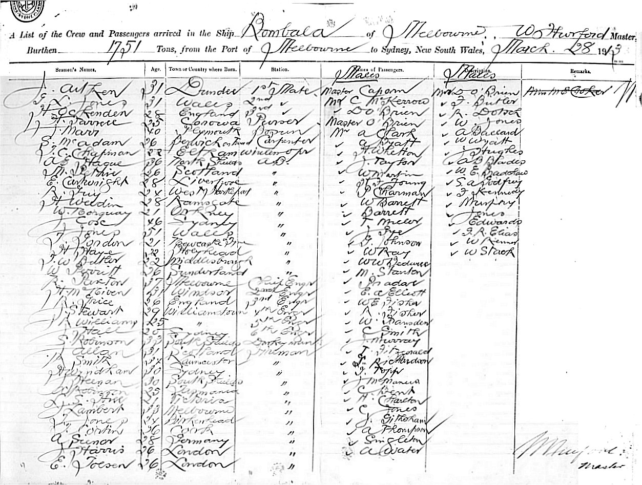 BOMBALAOF MELBOURNE, W. HURFORD, MASTER, BURTHEN 1751 TONS FROM THE PORT OF MELBOURNE TO SYDNEY, NEW SOUTH WALES, 28TH MARCH 1913 |