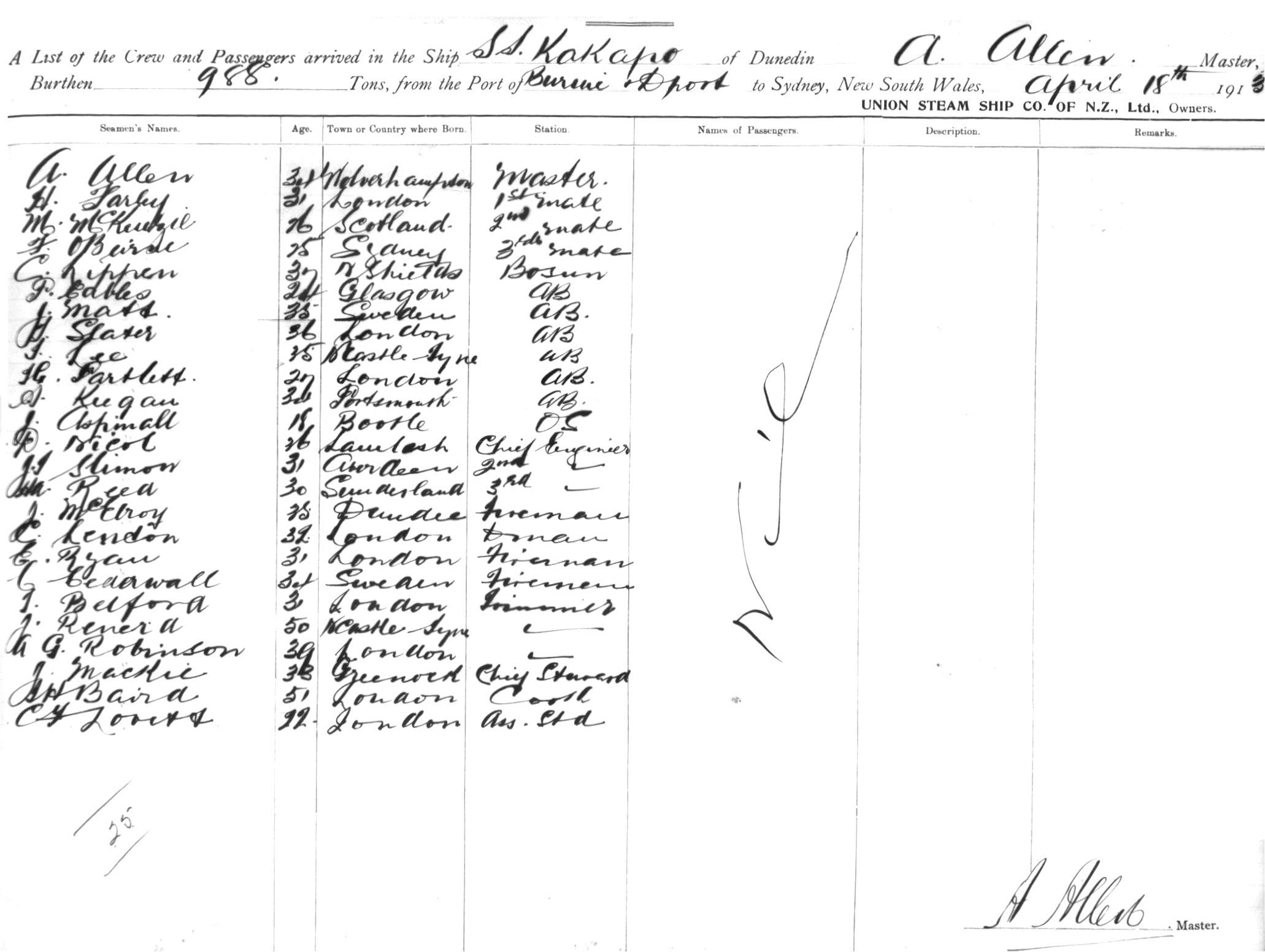 KAKAPOOF DUNEDIN, A. ALLEN, MASTER, BURTHEN 988 TONS FROM THE PORT OF BURNIE & DEVONPORT TO SYDNEY, NEW SOUTH WALES, 18TH APRIL 1913 |