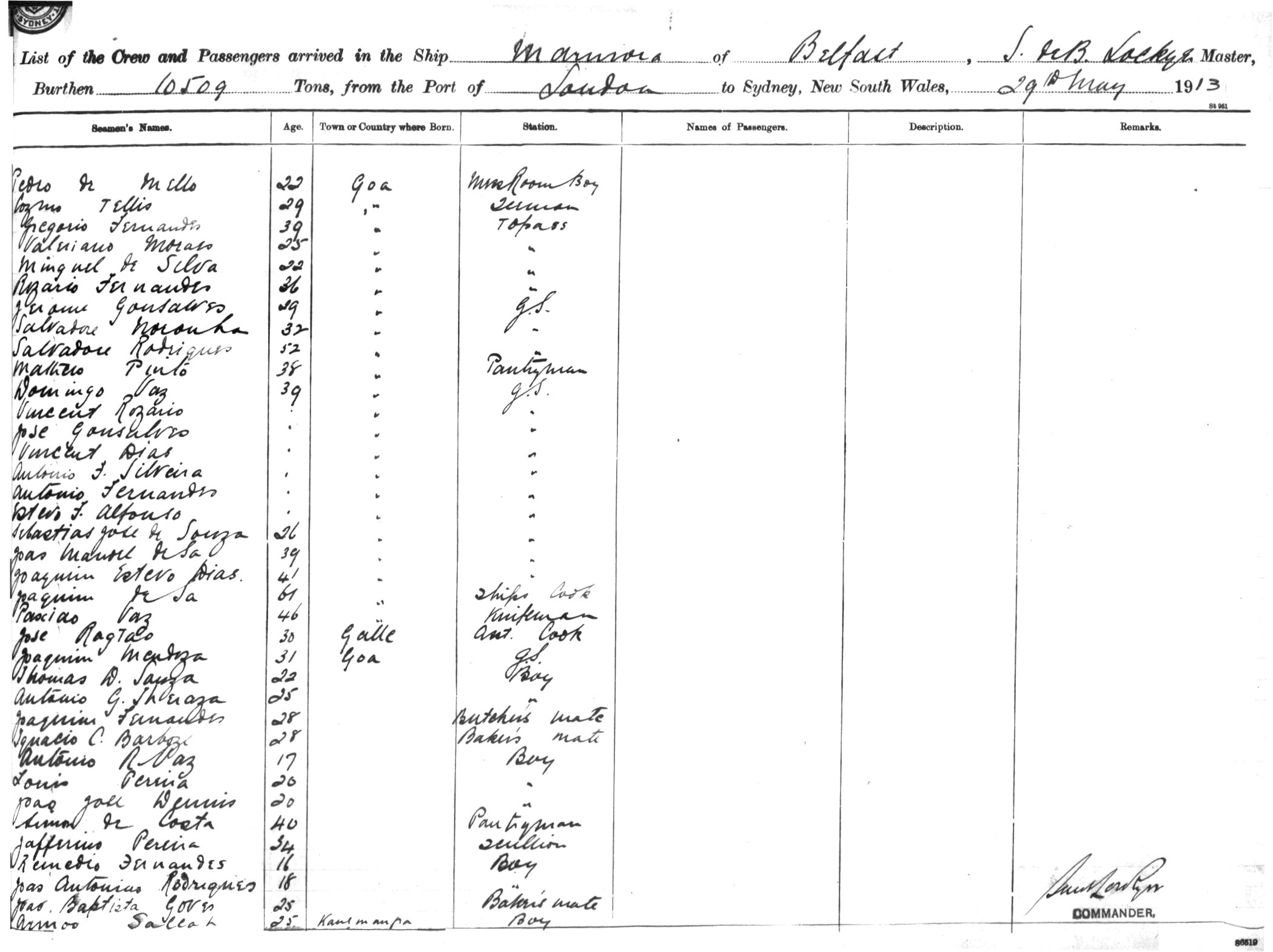 MARMORAOF BELFAST, S.K.B. LOCKYER, MASTER, BURTHEN 10509 TONS FROM THE PORT OF LONDON TO SYDNEY, NEW SOUTH WALES, 29TH MAY, 1913 |