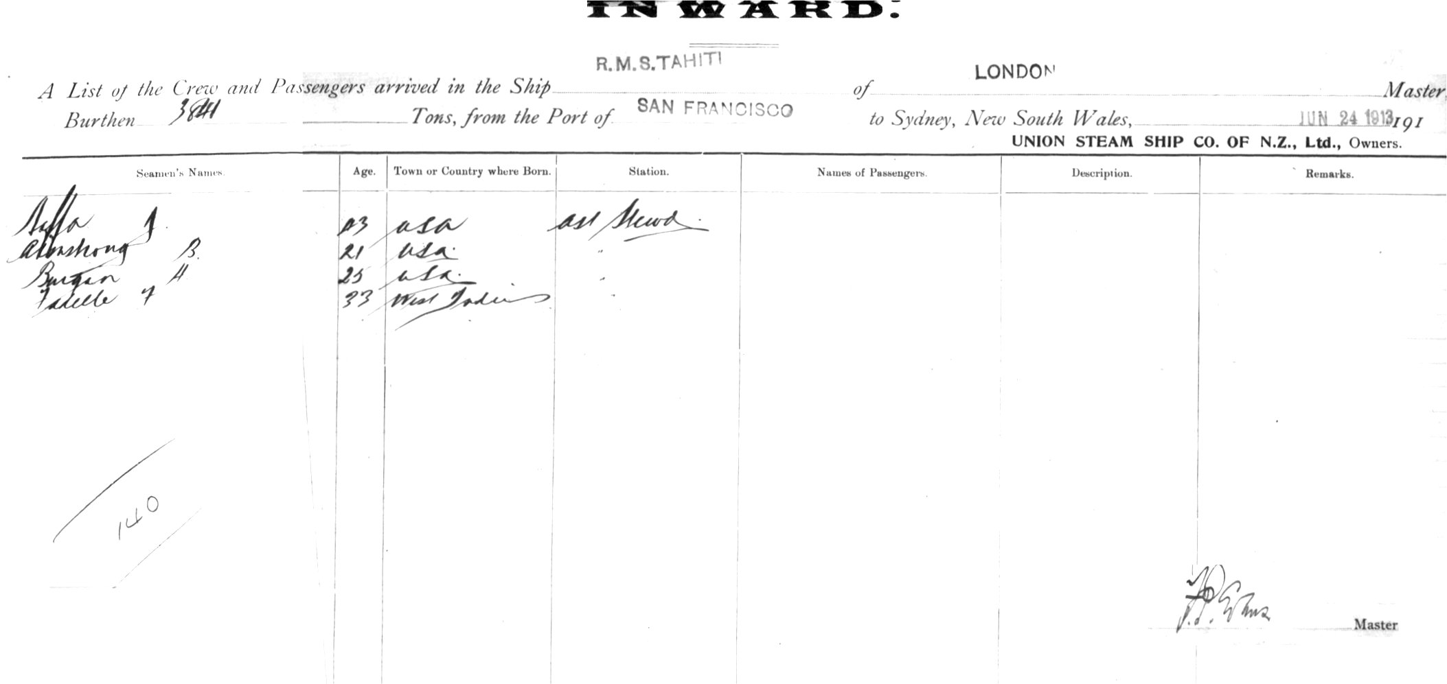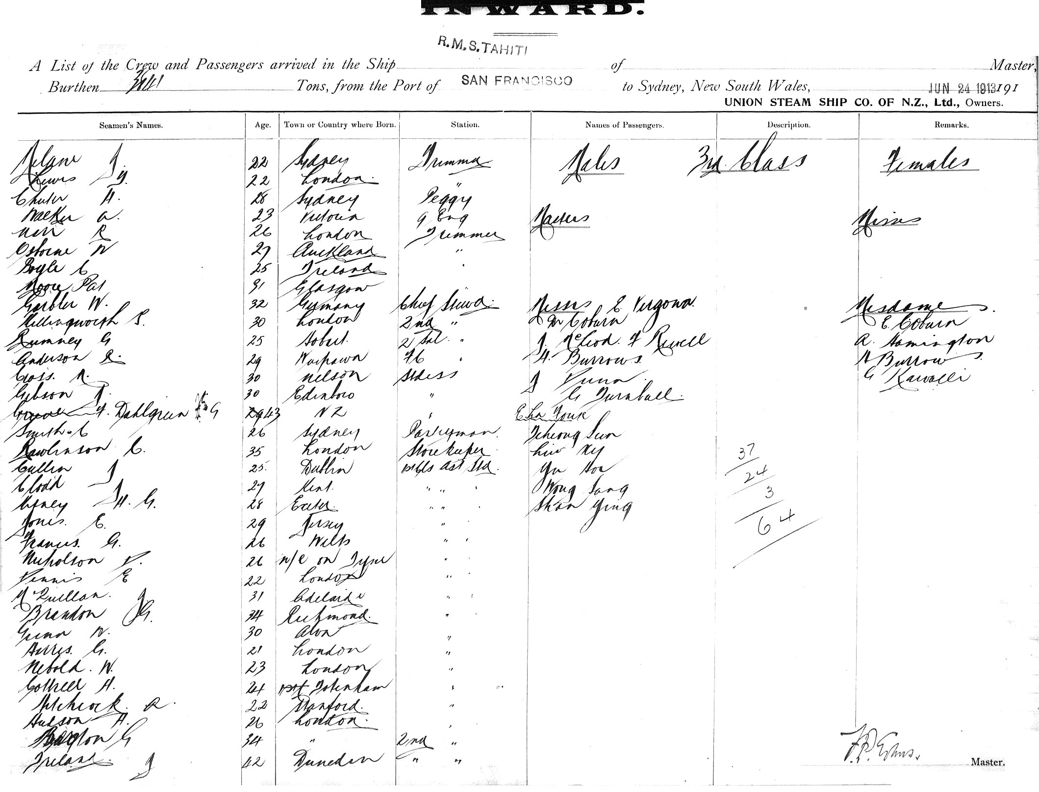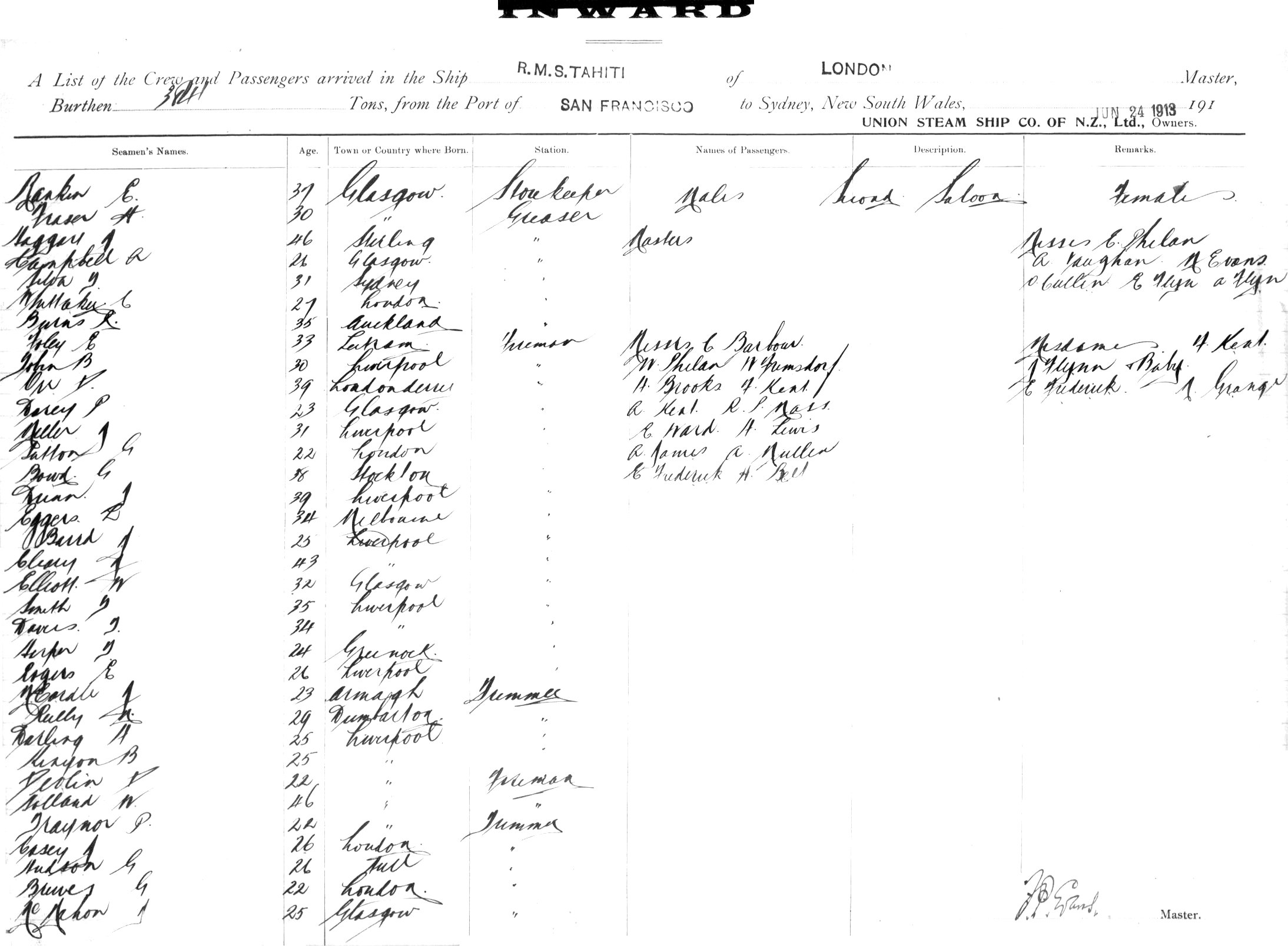 TAHITIOF LONDON, F. P. EVANS, MASTER, BURTHEN 3841 TONS FROM THE PORT OF SA FRANCISCO TO SYDNEY, NEW SOUTH WALES, 24 JUNE 1913 |