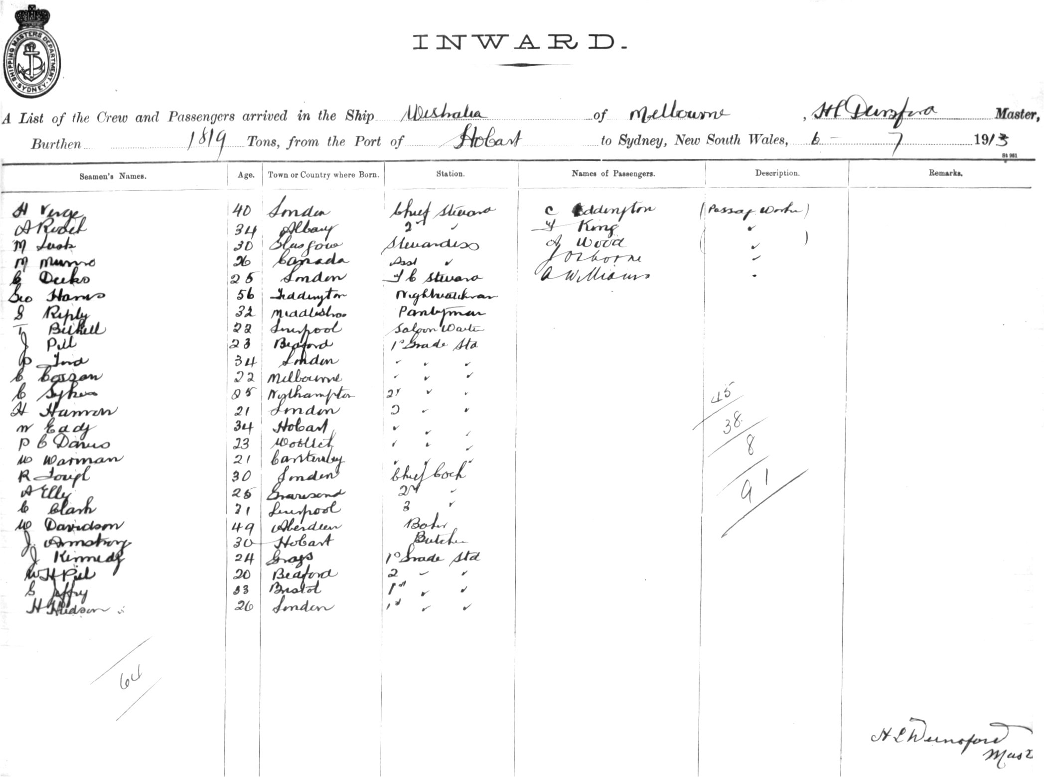 WESTRALIAOF MELBOURNE, H. L. DUNSFORD, MASTER, BURTHEN 1819 TONS FROM THE PORT OF HOBART TO SYDNEY, NEW SOUTH WALES, 06 JULY 1913 |