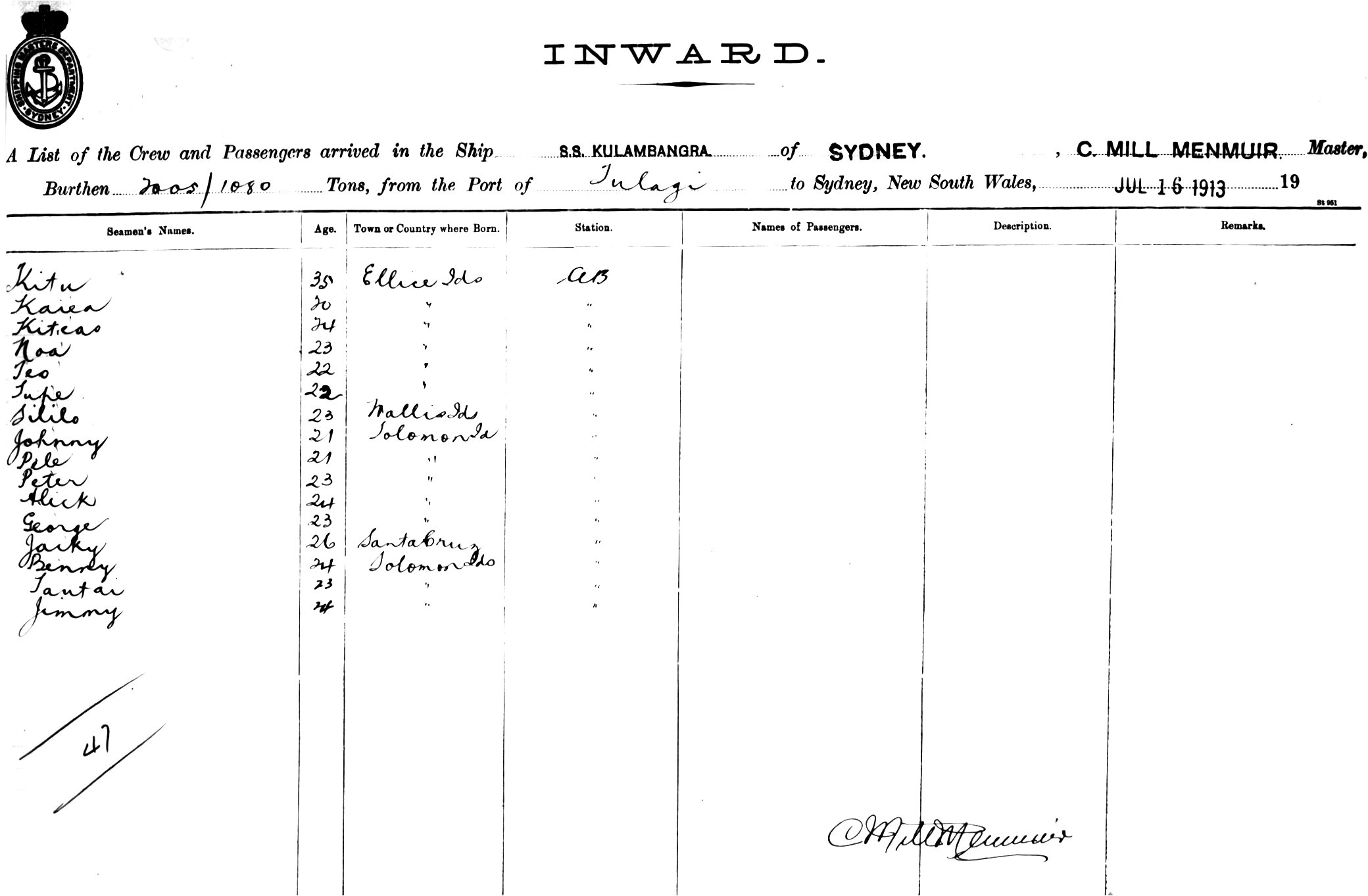 KULAMBANGRAOF SYDNEY, C. MILL MENMUIR, MASTER, BURTHEN 2005/1080 TONS FROM THE PORT OF TULAGI TO SYDNEY, NEW SOUTH WALES, 16 JULY 1913 |