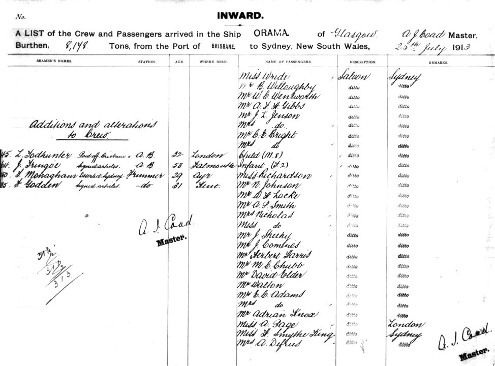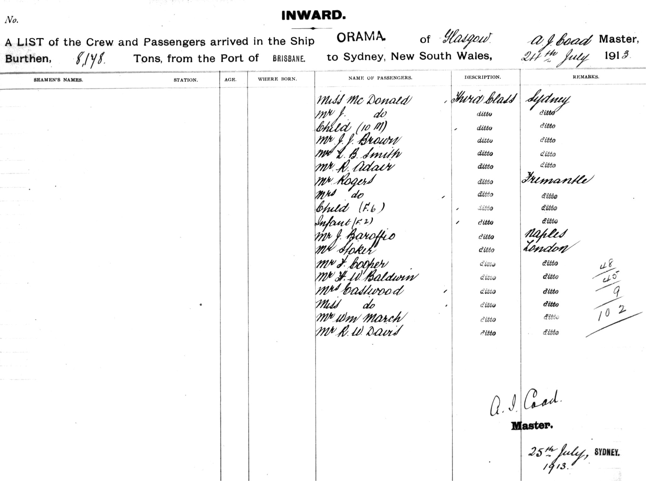 ORAMAOF GLASGOW, A J COAD, MASTER, BURTHEN 8178 TONS FROM THE PORT OF BRISBANE TO SYDNEY, NEW SOUTH WALES, 25TH JULY 1913 |