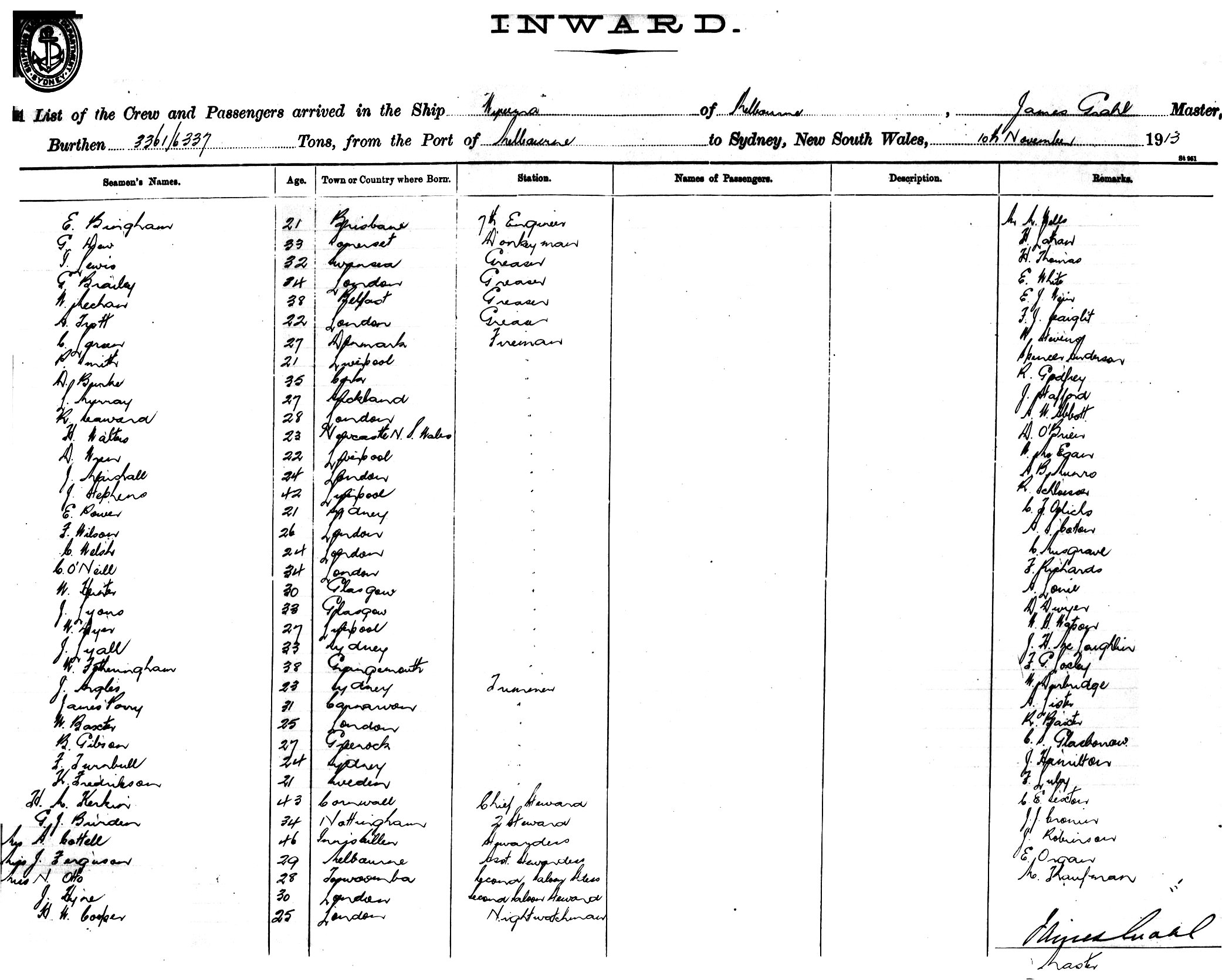 WYREEMAOF MELBOURNE, JAMES GRAHL, MASTER, BURTHEN 3361 / 6337 TONS FROM THE PORT OF MELBOURNE TO SYDNEY, NEW SOUTH WALES, 10 NOVEMBER 1913 |