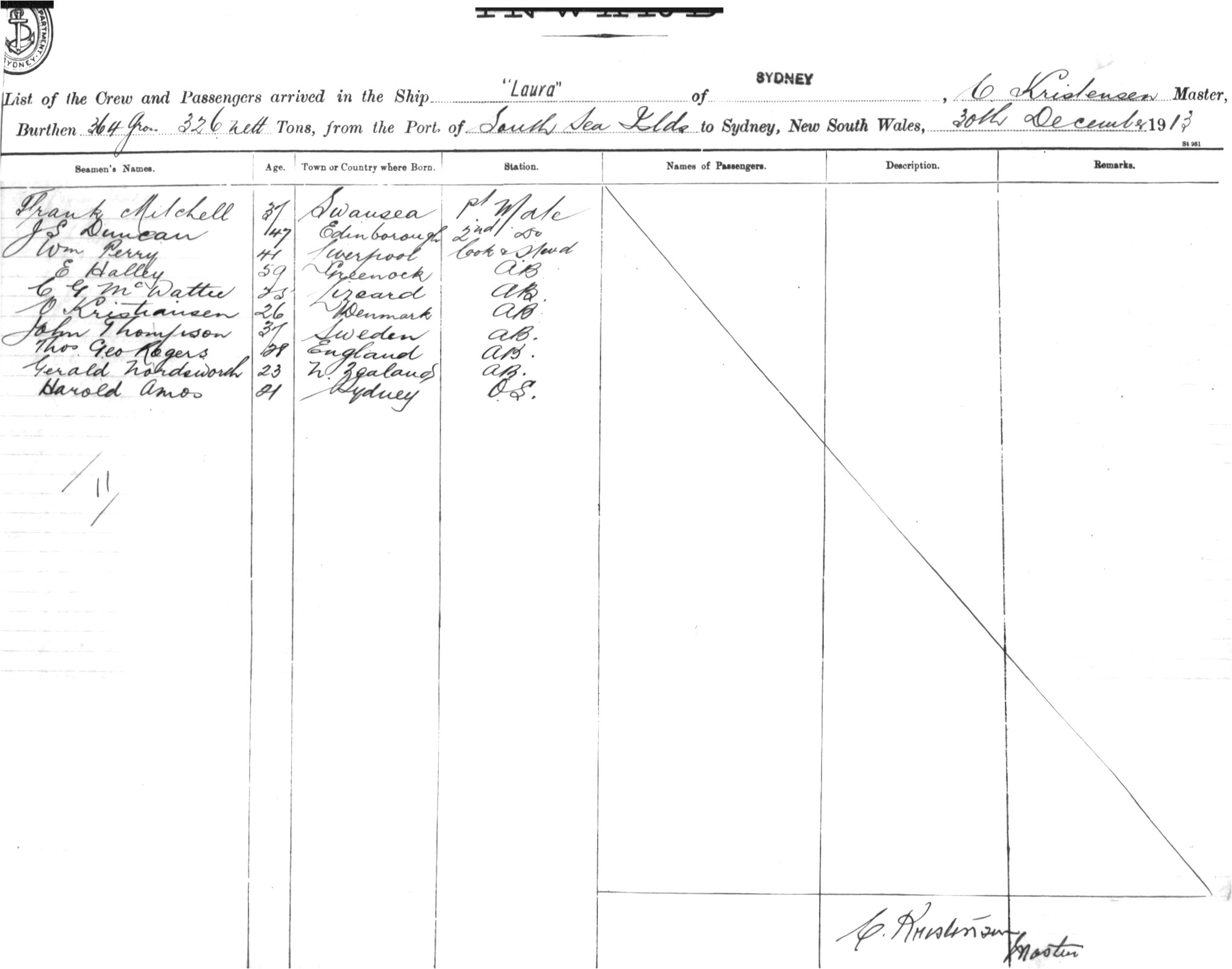 LAURAOF SYDNEY, C. KRISTENSEN, MASTER, BURTHEN 364/326 TONS FROM THE PORT OF SOUTH SEA ISLANDS TO SYDNEY, NEW SOUTH WALES, 30TH DECEMBER 1913 |