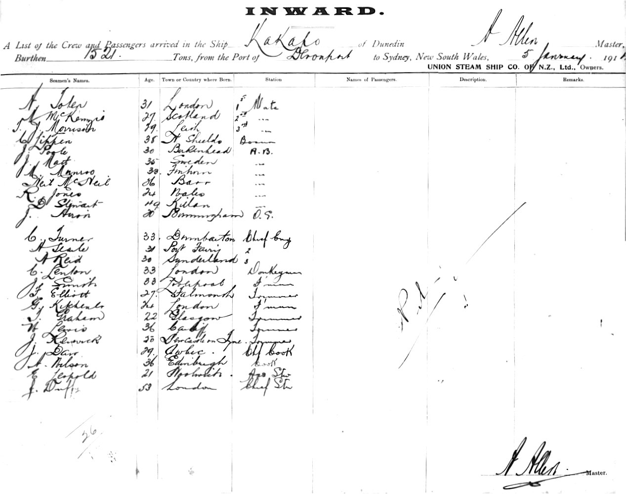 KAKAPOOF DUNEDIN, A. ALLEN, MASTER, BURTHEN 1521 TONS, FROM THE PORT OF DEVONPORT TO SYDNEY, NEW SOUTH WALES, 5TH JANUARY 1914 |