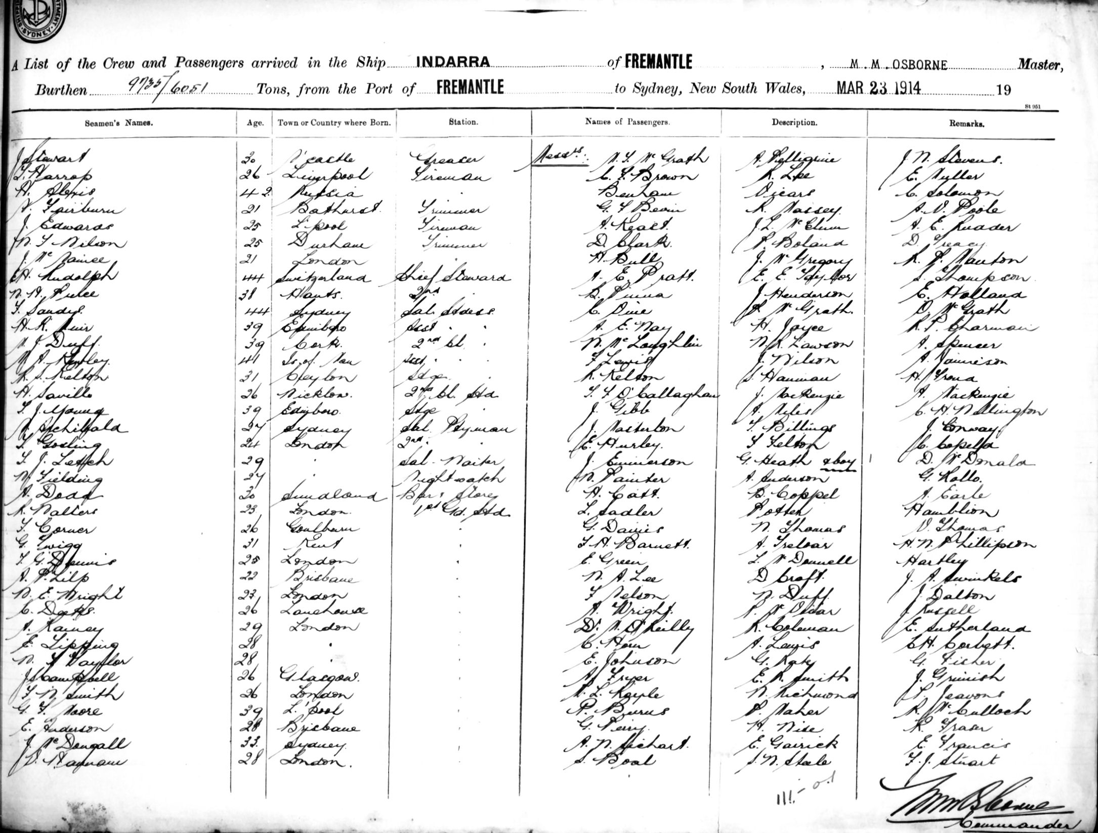 INDARRAOF FREMANTLE, M.M. OSBORNE, MASTER, BURTHEN 9735/6051 TONS FROM THE PORT OF FREMANTLE via ADELAIDE & MELBOURNE TO SYDNEY, NEW SOUTH WALES, 23RD MARCH 1914 |