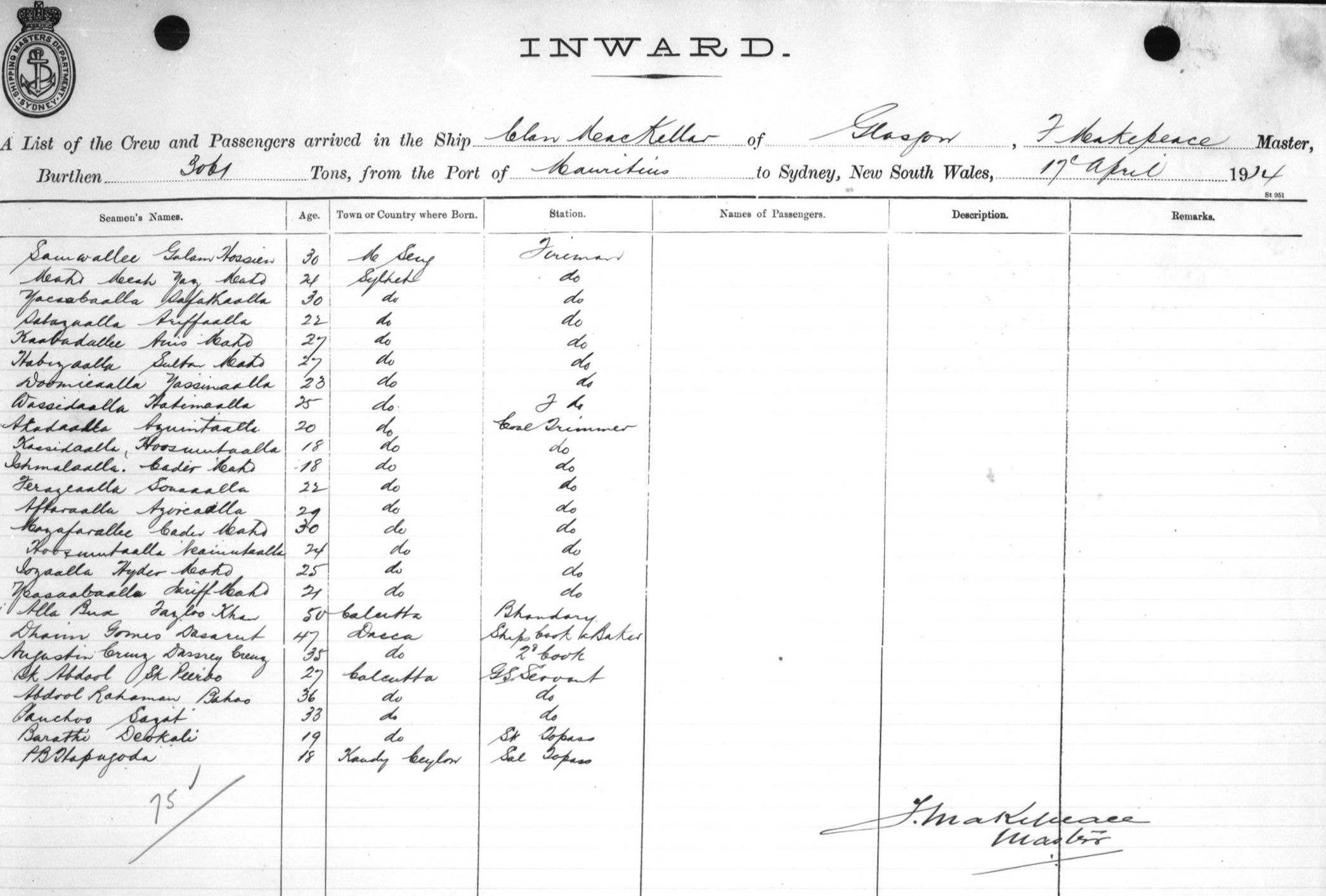 CLAN MACKELLAROF GLASGOW, FRANK MAKEPEACE, MASTER, BURTHEN 3062 TONS FROM THE PORT OF MAURITIUS VIA BUNBURY TO SYDNEY, NEW SOUTH WALES, 17TH APRIL 1914 |