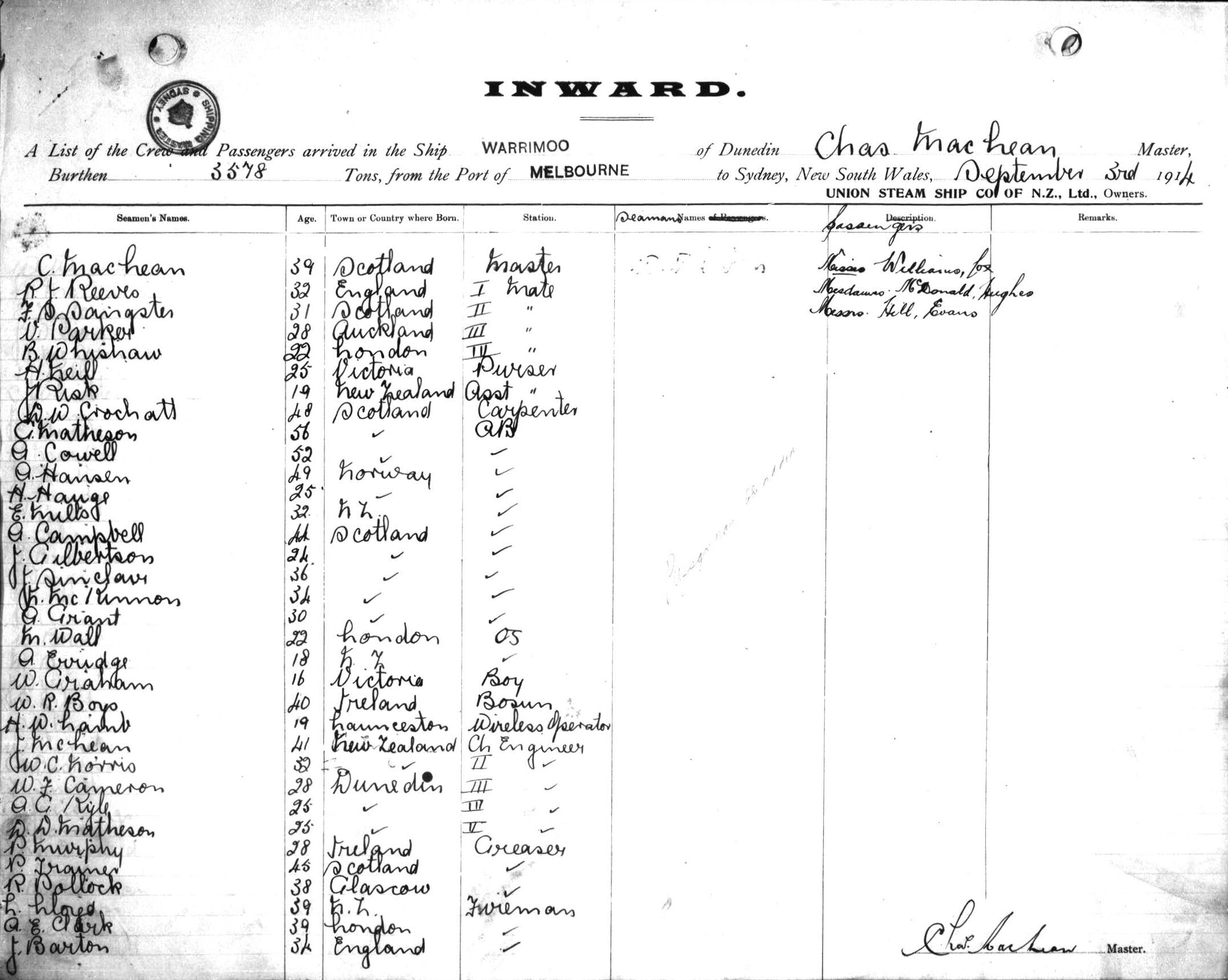 WARRIMOOOF DUNEDIN, CHARLES MCLEAN, MASTER, BURTHEN 3578 TONS FROM THE PORT OF MELBOURNE TO SYDNEY, NEW SOUTH WALES, 3RD SEPTEMBER 1914 |